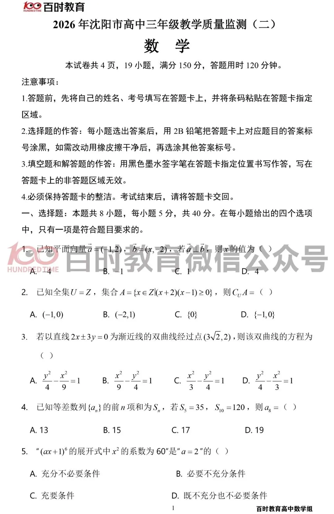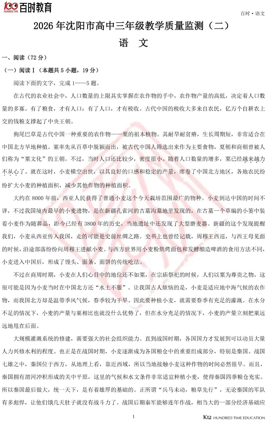>2026年4月沈阳高三二模试卷(语文/数学)+分析!
