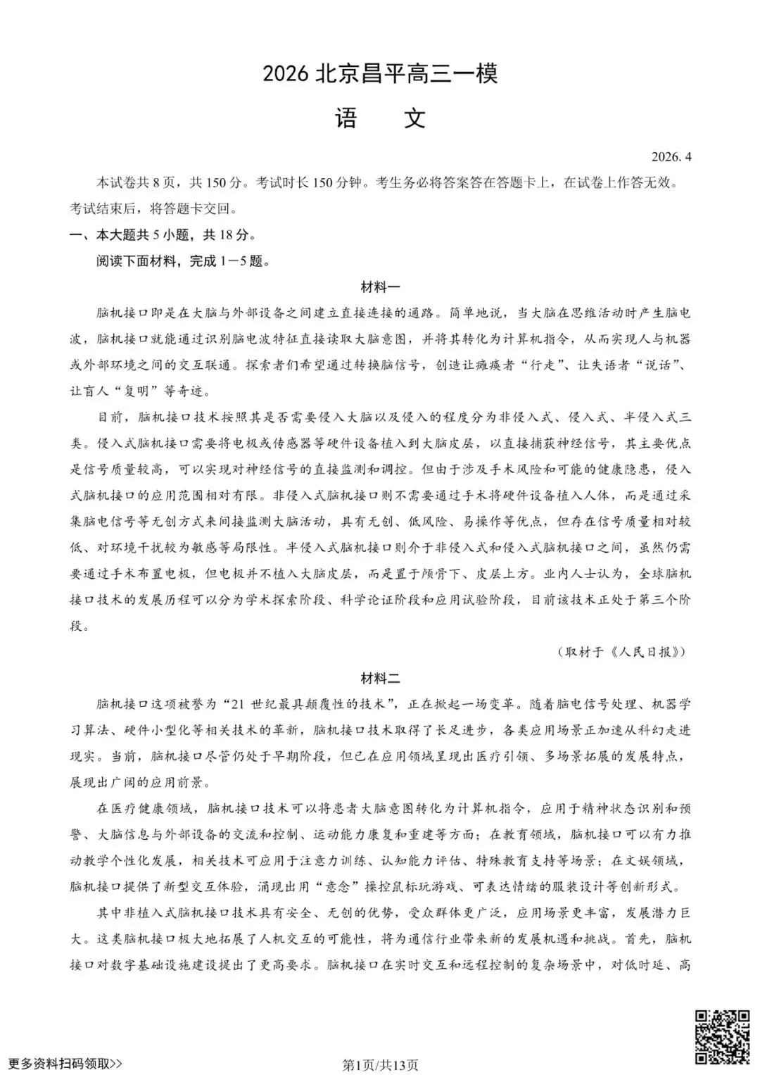 今天给大家分享的是2026北京昌平高三一模语文试卷(含答案),其他区域或学校的学生都可以练一练。近期会持续分享,欢迎大家多多关注,也可以把我们分享给更多人哦。