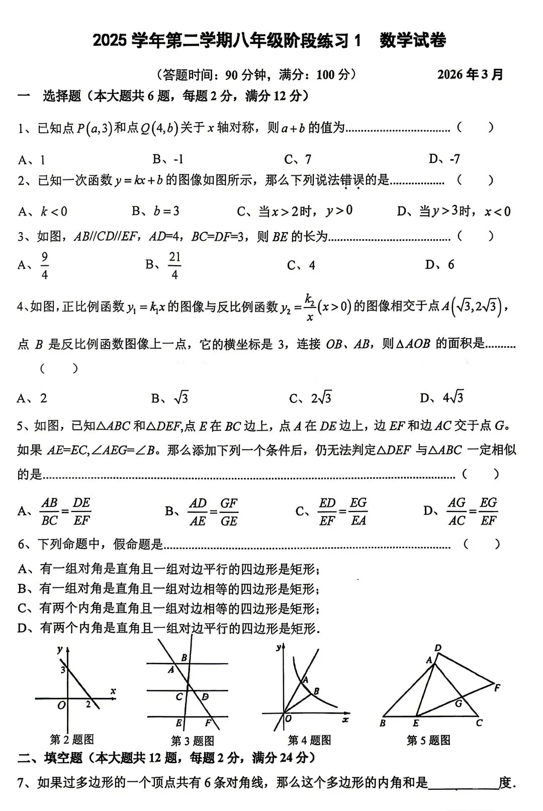>上宝中学八下数学月考试卷及答案(2026.3)