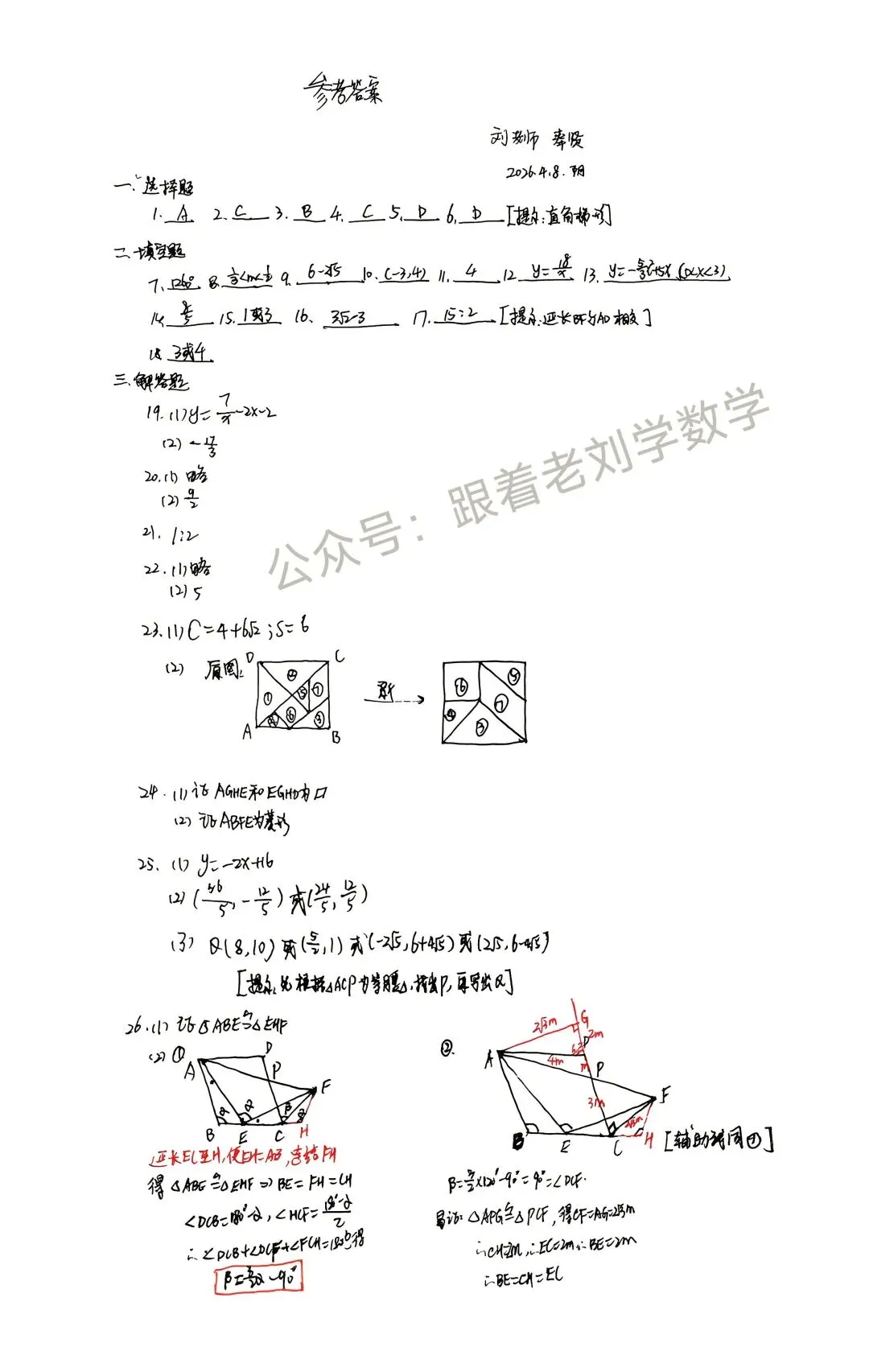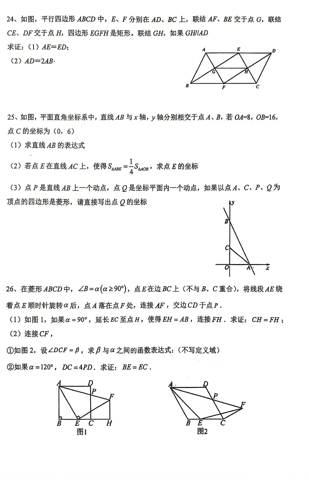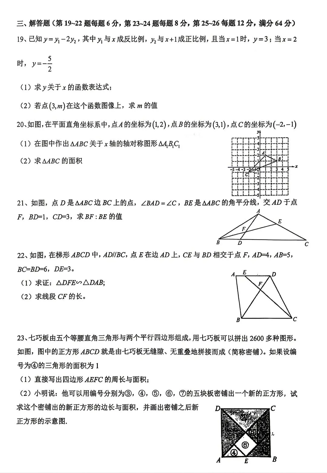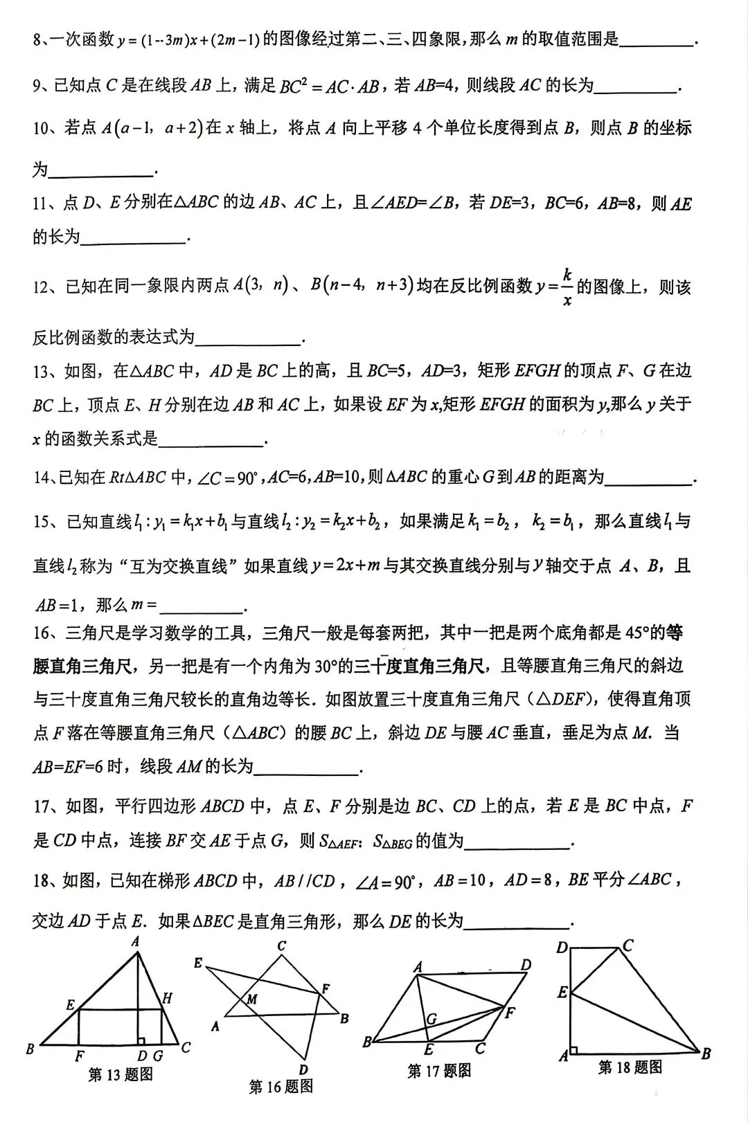 刘老师点评:考察内容为八下所有内容+九上相似。最后一题为闵行期末原题。整体难度适中,题量较大!