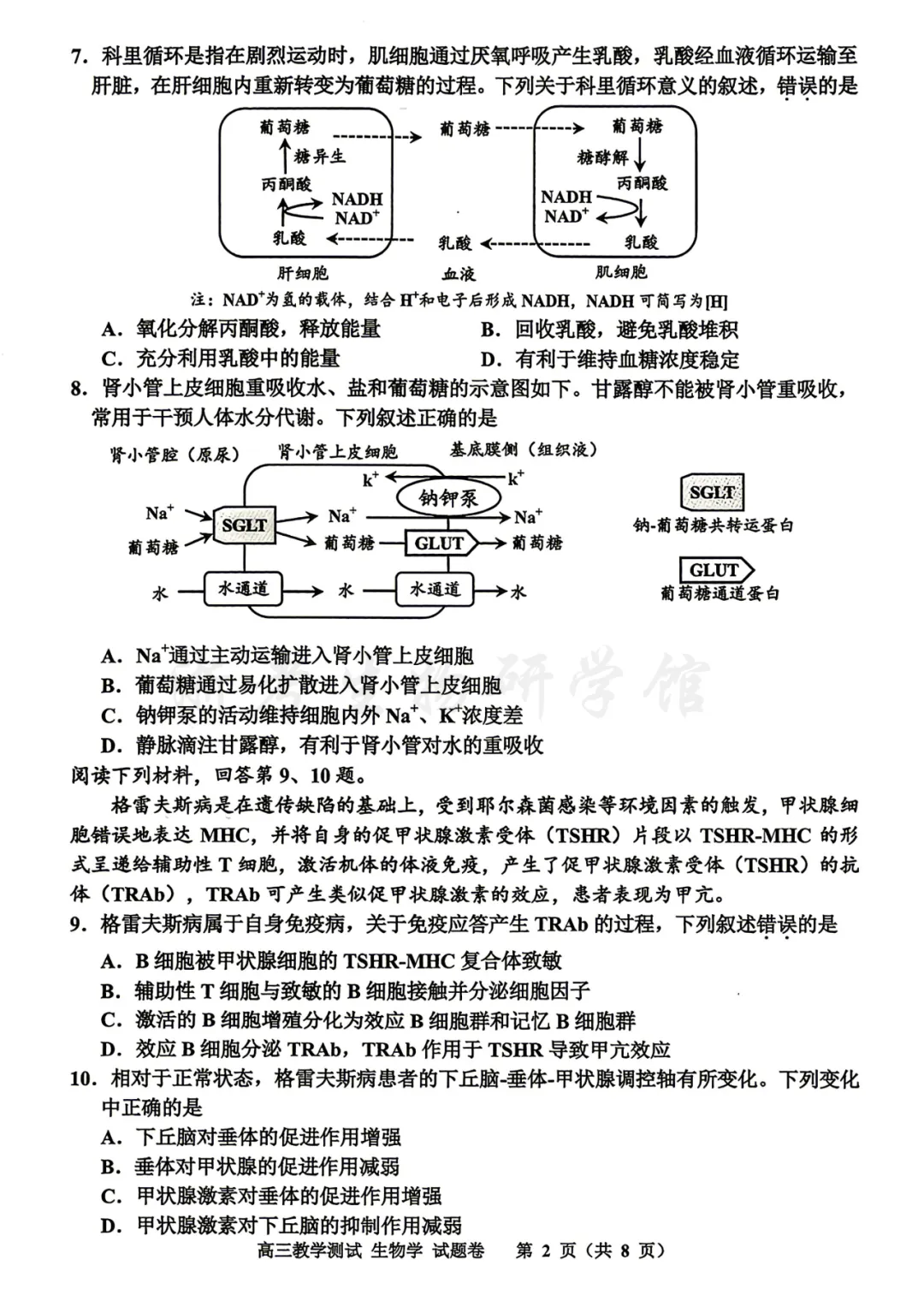 9.A 解析:A.在体液免疫中,辅助性T细胞通过识别抗原-MHC复合体被激活,再分泌细胞因子作用于致敏的B细胞,B细胞的致敏不会被甲状腺细胞的TSHR-MHC复合体间接致敏,课本上讲的是B细胞可以直接识别抗原,错误
