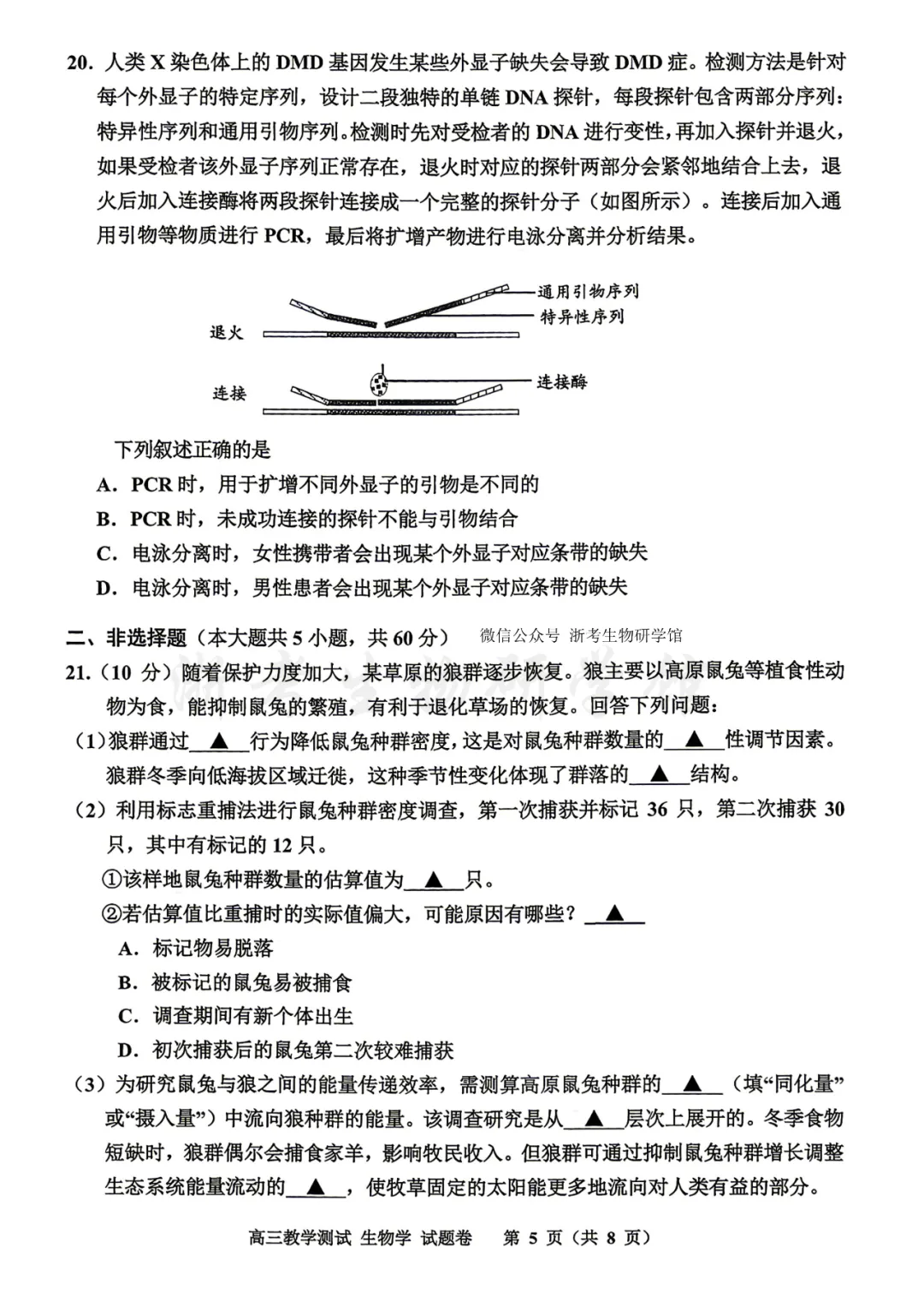 20.A 解析:A.因为探针是针对每个外显子的特定序列设计的,且每段探针包含特异性序列和通用引物序列,不同外显子的碱基序列不同,因此识别它们的特异性序列不同,正确