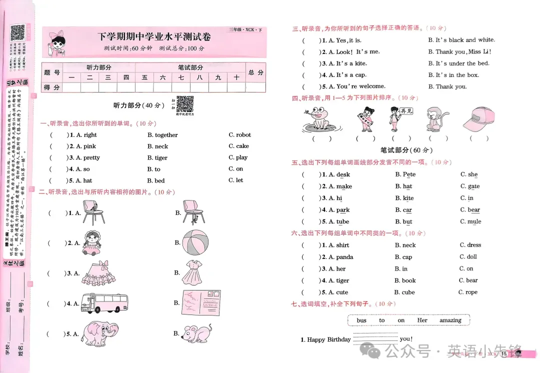 >【期中试卷】科普英语三年级下册期中试卷一 (可下载)