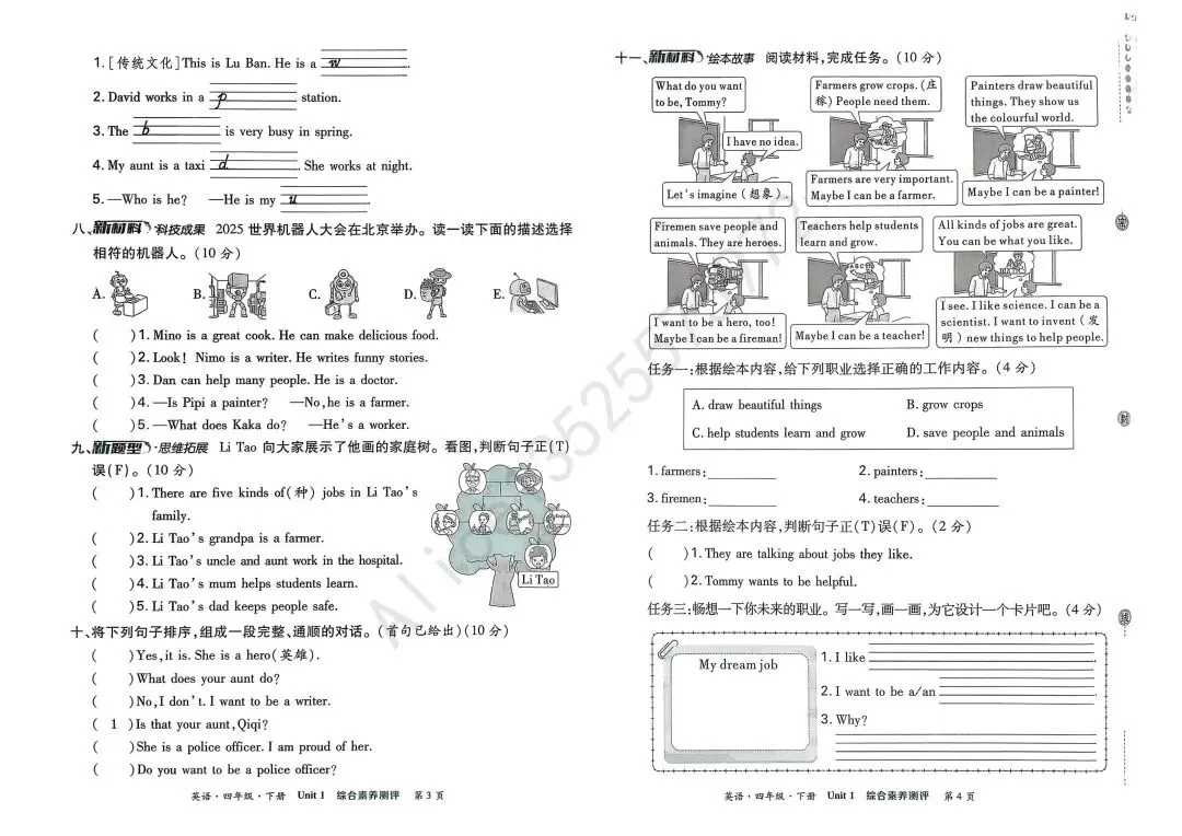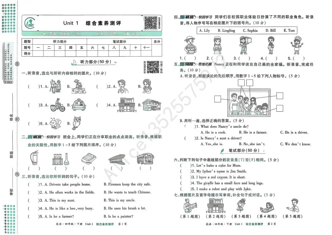 Hello,大家好,我是教英语的Alice陈老师,2026外研社英语三起四下unit1 综合素养测评。试卷+讲解视频如下: