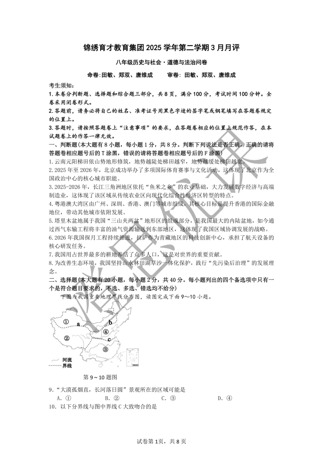 >月考试卷丨锦绣育才教育集团2025-2026学年八年级第二学期3月月评问卷(社会)