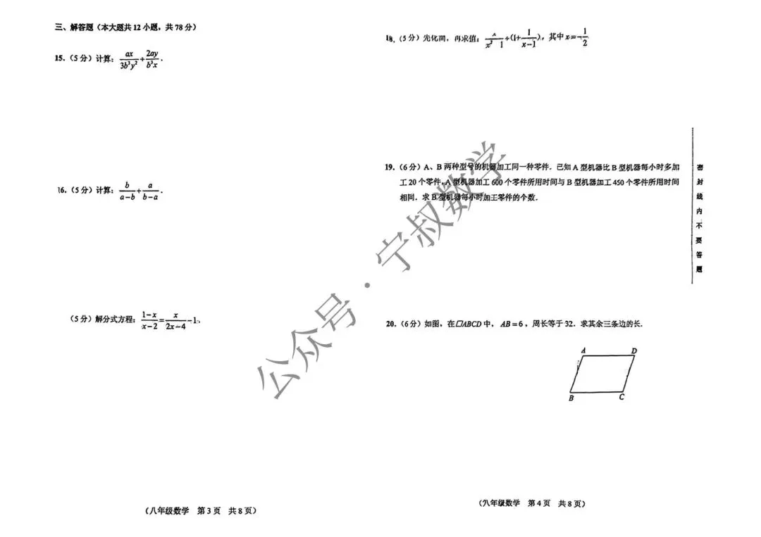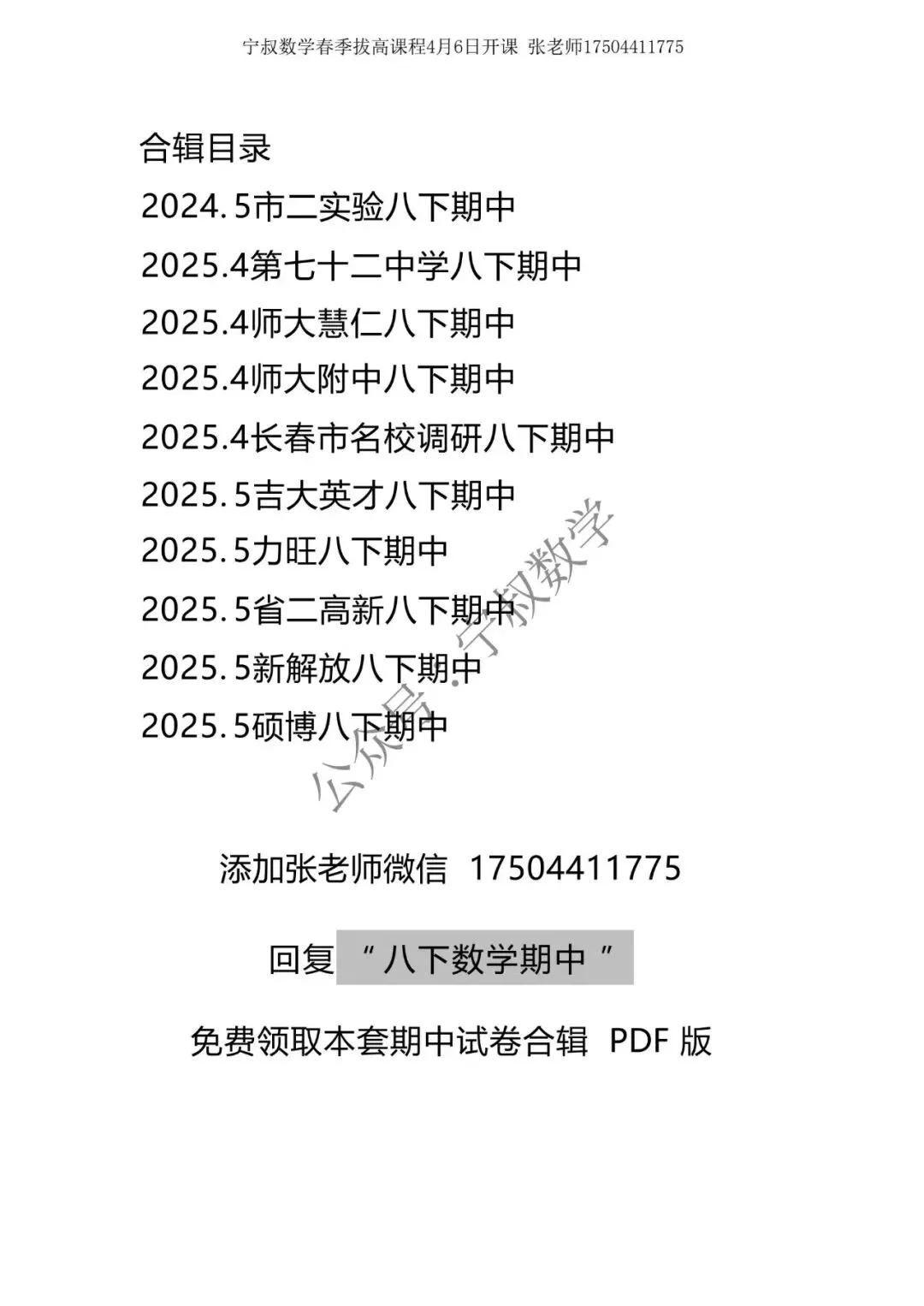 特别说明:本号由数学张老师(笔名宁叔)主理运营,所分享的试卷和资料,只用于帮助老师和学生们的学习使用,仅供参考。试卷资料收集随缘,部分试卷收集时便无答案。如需更全面更系统的长春名校试卷和习题(付费教辅资料),可直接添加张老师微信咨询(17504411775电话同微),整理资料不易,能力有限,非诚勿扰。