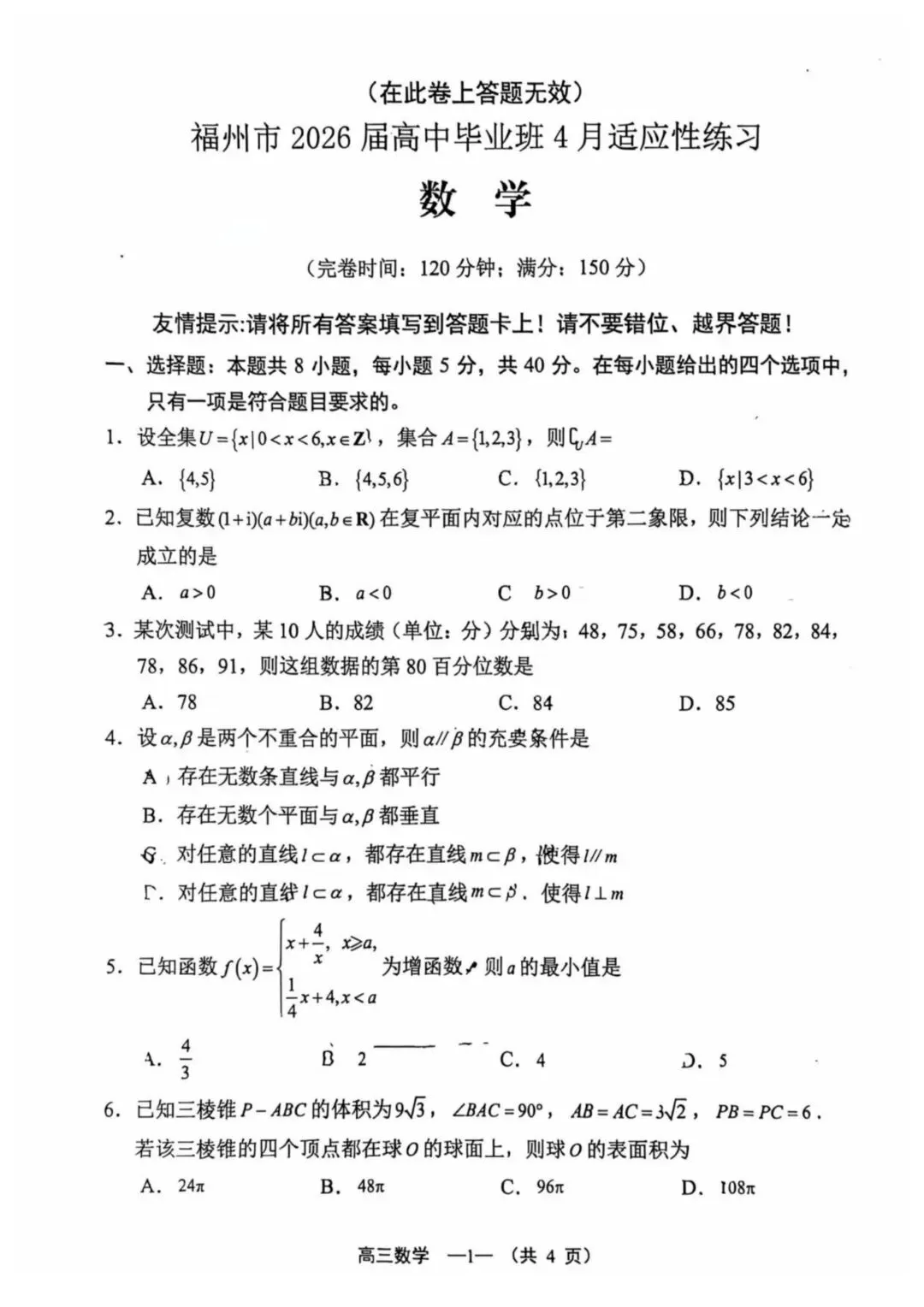 >2026福建4月质检高考数学试卷+答案解析