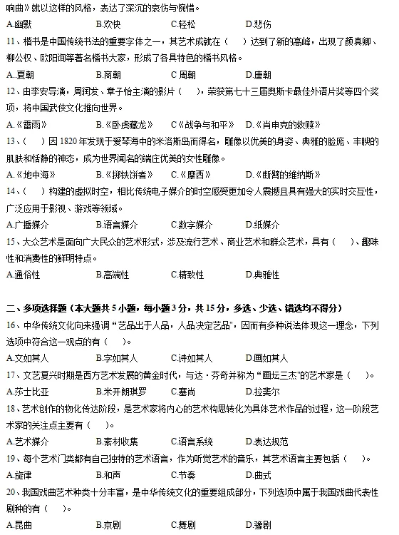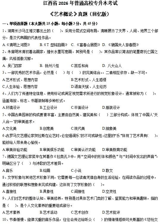>2026年江西专升本考试《艺术概论》真题(回忆版)