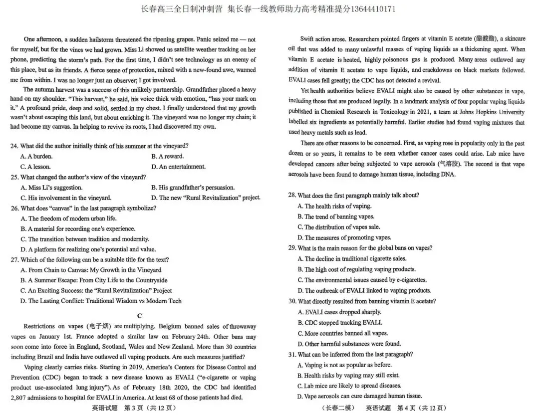 长春市2026届高三质量检测二 语文试卷及答案 数学英语物化生政史地 考后陆续更新