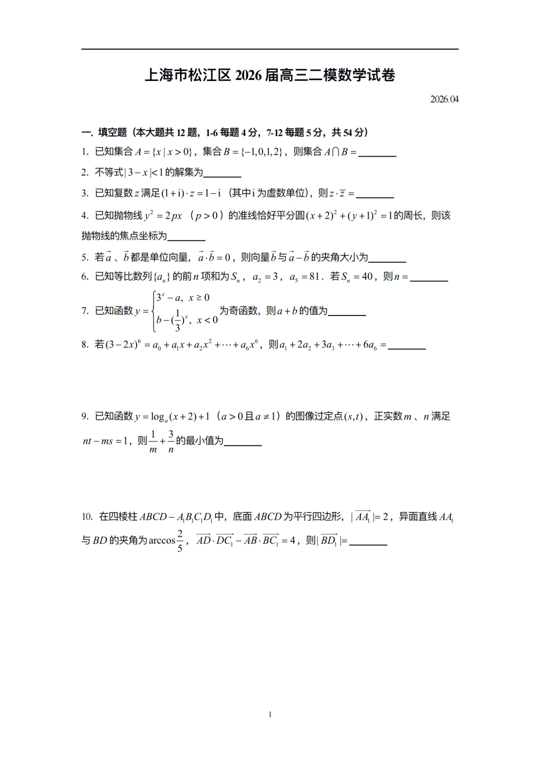 试卷分享0027:2026届上海奉贤区高三二模 数学(答案+难题详解)