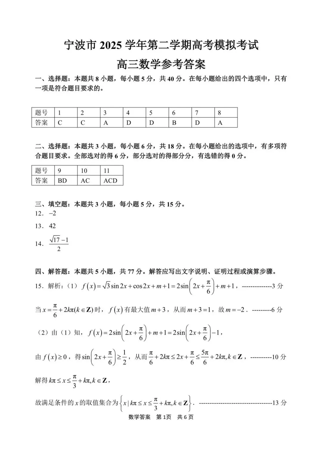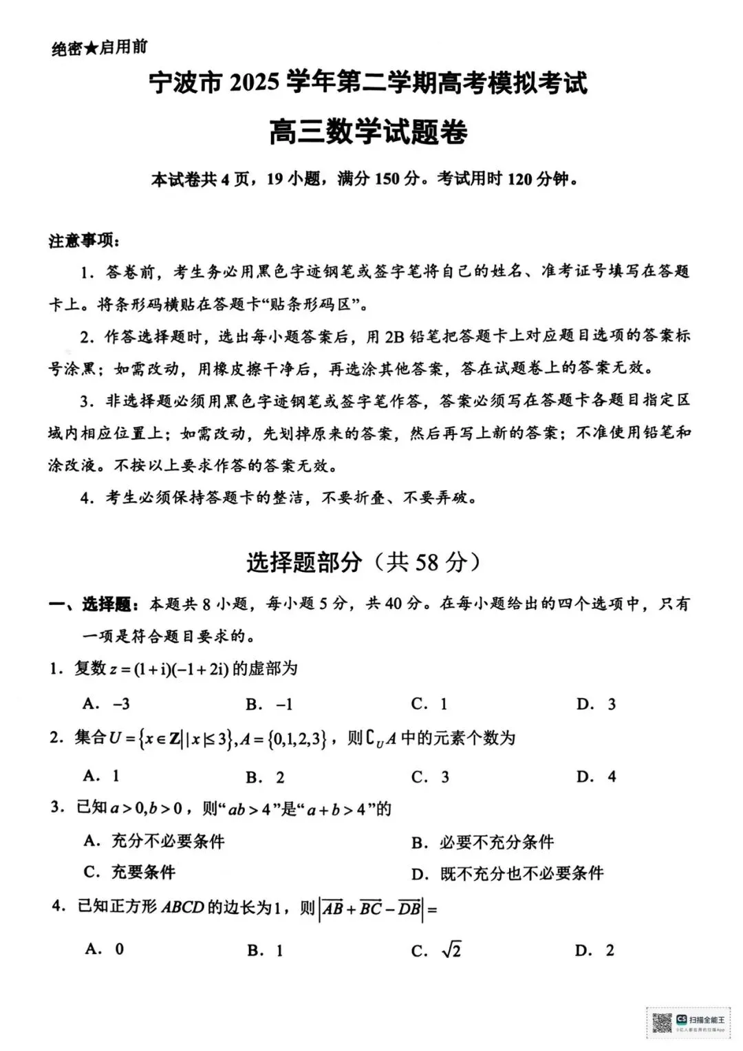 【试卷+答案】浙江省宁波市2025-2026学年高三下学期全科试卷及答案汇总
