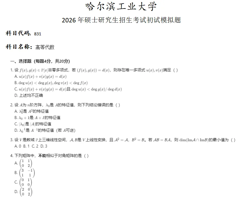 当前位置:首页>考研真题>哈尔滨工业大学831高等代数考研真题模拟