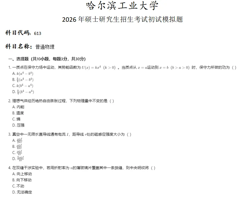 当前位置:首页>考研真题>哈尔滨工业大学613普通物理考研真题模拟