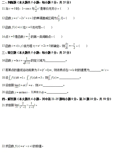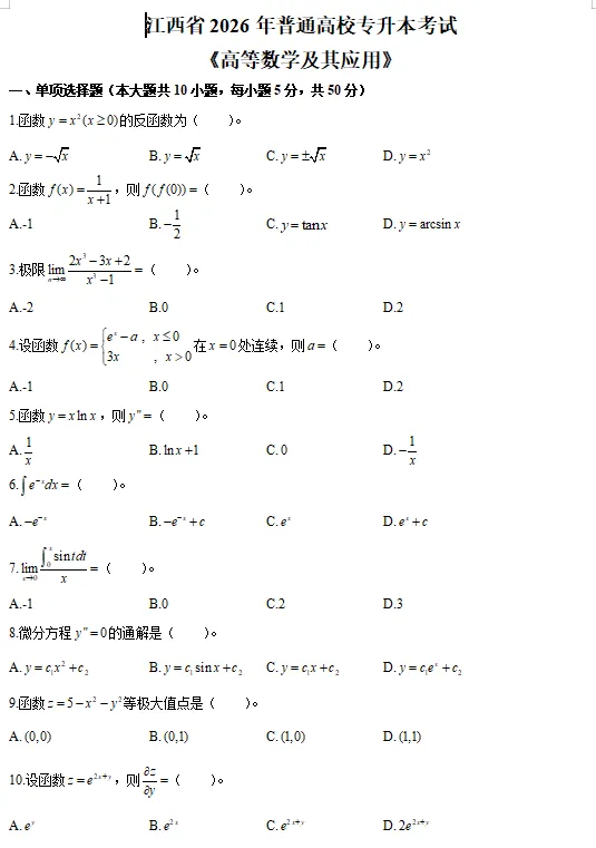 >2026年江西专升本考试《高等数学》真题(回忆版)