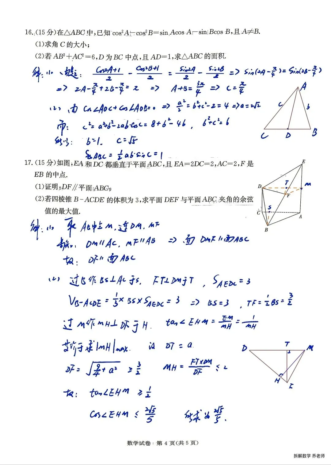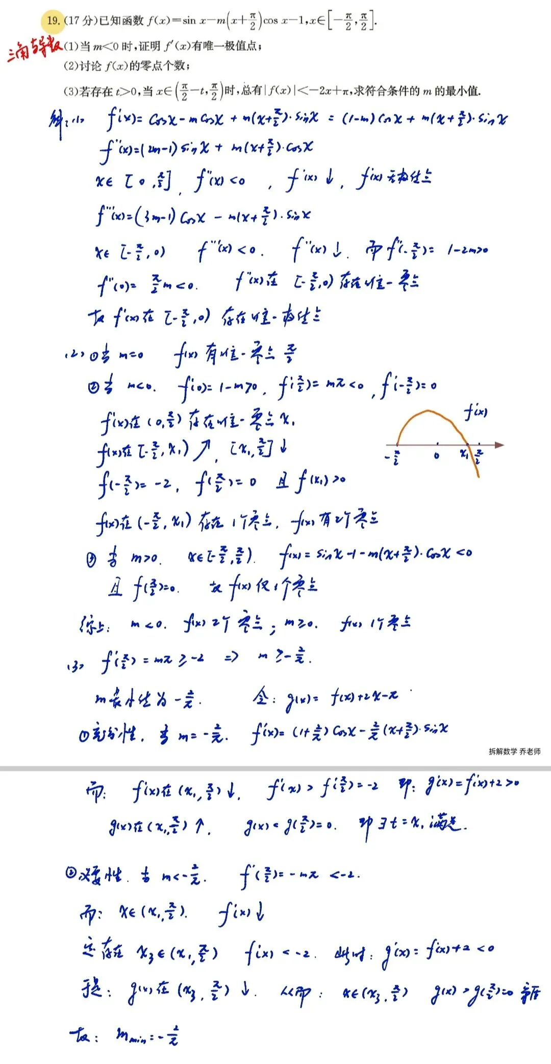 19题,三角与导数的综合,此题前两问考点核心是三角类导数最重要的处理思路,即分段分析,与25年19题有明显的区别,且难度相对轻松。第三问十分有意思,更考验数学思维,通过比较曲线在右端点处的切线斜率与不等式右边直线斜率大小,能快速猜到参数范围,接下来进行充要性证明即可。