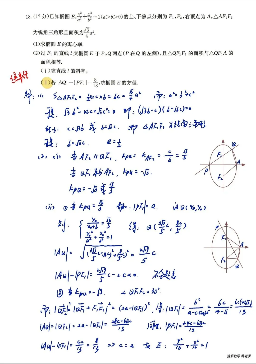 18题,与长沙一模17题类似,一道反套路极强的解析几何大题,最后一问求圆锥曲线方程,看似简单,但极易出错,每小问都有两种情况,第三问解法较多,利用焦半径公式处理相对轻松。