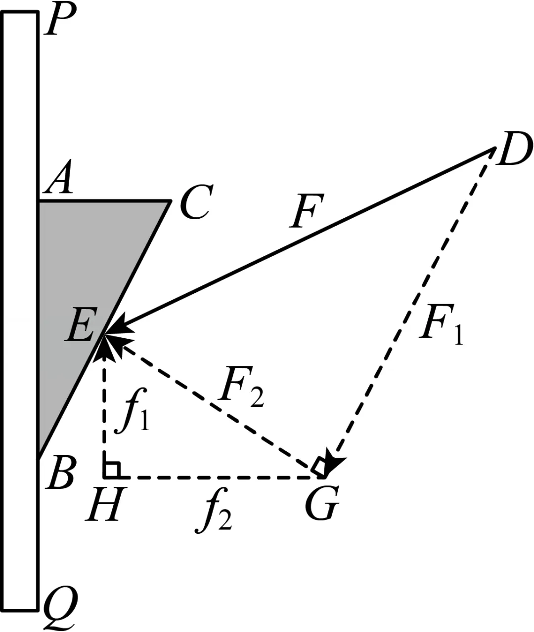 17.在一次物理课上,小明进行了一次小实验,将一块直角三角形木块ABC(轻质木块重力忽略不计)的直角边AB紧紧贴在光滑(摩擦力视为0)的竖直墙壁PQ上,木块斜面BC与AB的夹角为30°.用与BC的夹角为37°(即∠CED=37°)的力F(F为50N)作用在小木块上的点E处.木块竟然在力F的作用下沿墙壁PQ向上滑动.小明百思不解,于是老师画出受力的示意图(如图)帮助小明分析,作用力F可以分解为两个力F1与F2,其中F1的方向与BC平行,对木块滑动不起作用,与木块垂直的力F2可以分解为竖直方向上的力f1和水平方向上的力f2,f2与墙面对木块的弹力大小相等、方向相反,合力为0,力f1的方向与墙面平行,推动木块沿墙壁向上滑动.力的大小可以用线段的长度表示,若DE=F=50N,求推动木块滑动的力f1的值.(精确到1N.参考数据:sin37°≈0.60,cos37°≈0.80,tan37°≈0.75,