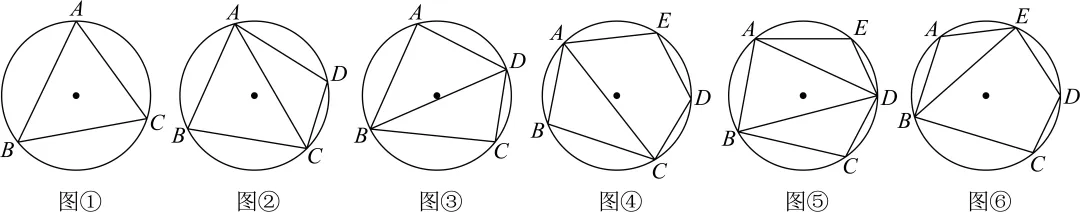 【探究主题】一个圆上有n(n≥3)个点,任意连接两个点可得到圆的一条弦,且所连的弦不能产生除这n个点以外的新交点,经探究发现这些弦可以将圆分成若干个不重叠的部分,但一共有多少种不同的分法呢?