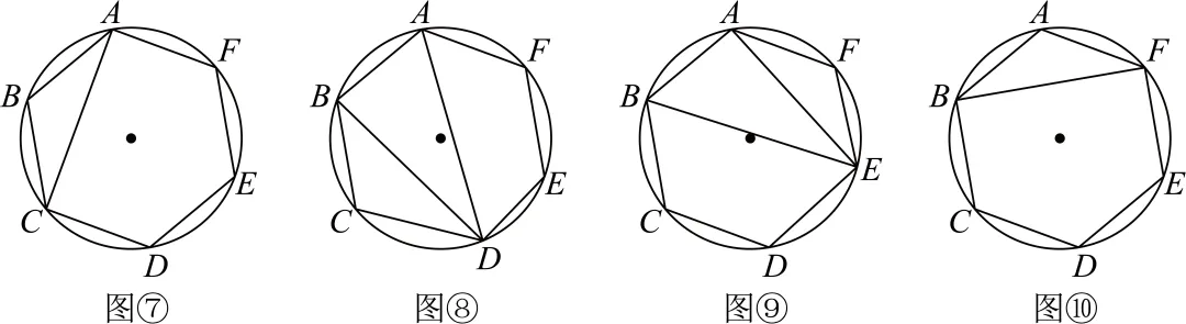 第1种情况如图⑦,将点C与点A连接,这样得到△ABC和五边形ACDEF,由对n=5时的分析知,此种情况共有k5种不同的分法;第2种情况如图⑧,将点D分别与点A,B连接,这样得到△BCD,△ABD和四边形ADEF,这样有k4种不同的分法,