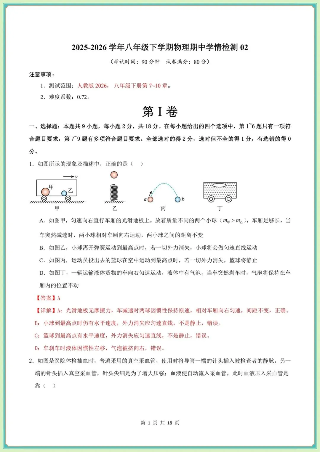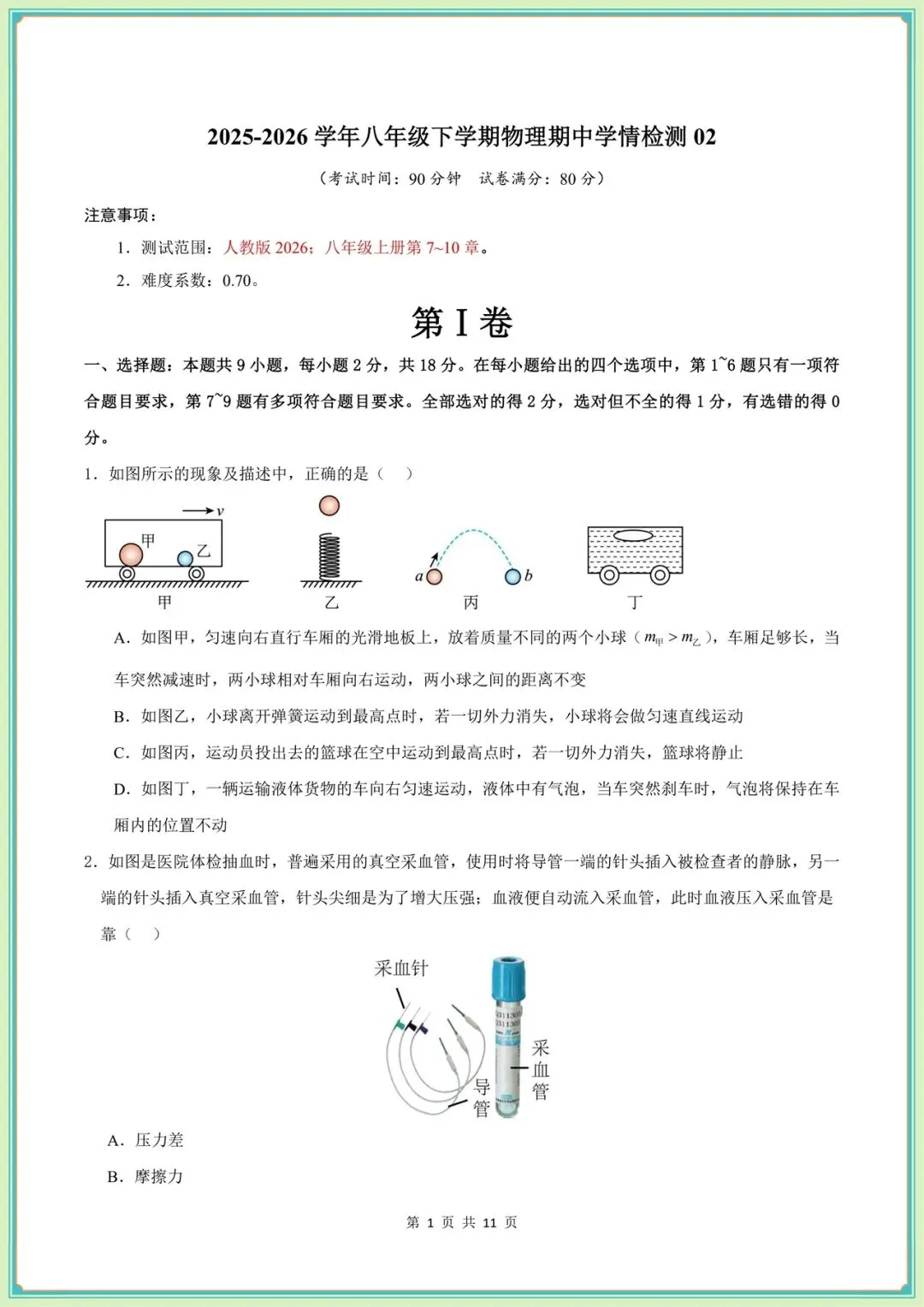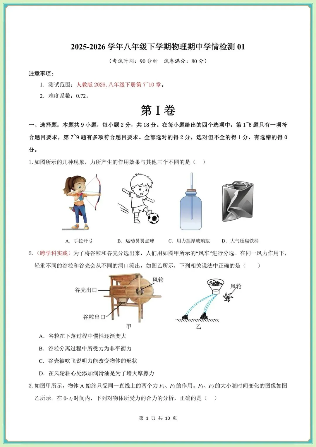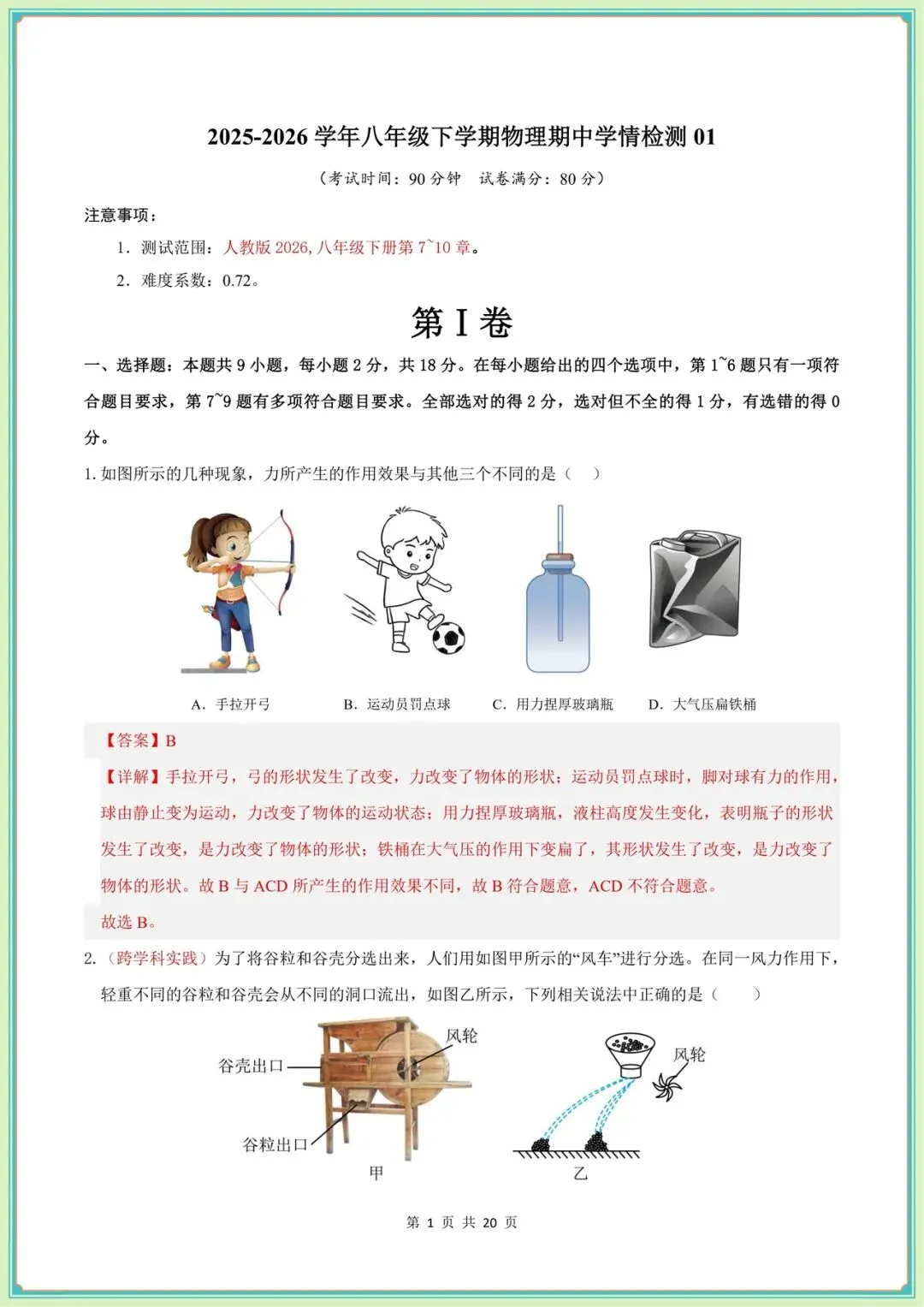 2026春人教版八年级下册《物理》期中试卷(7套含答案),电子版可打印!