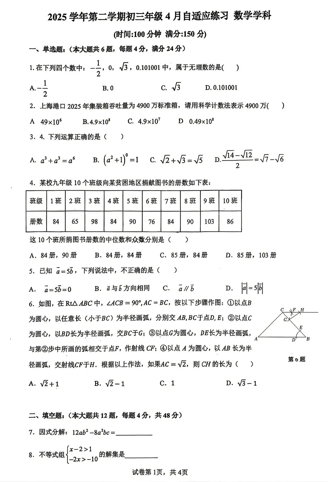 >进才中学北校初三数学月考试卷及答案(2026.4)