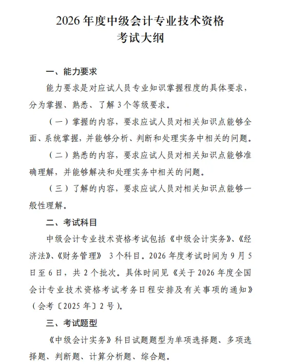 …… 好了,今天给大家带来的2026年中级会计考试大纲及复习资料,就先介绍到这里了。各位同学需要参考复习的,可以收藏备用!从新的考试大纲来看,基本没有啥的大变化。