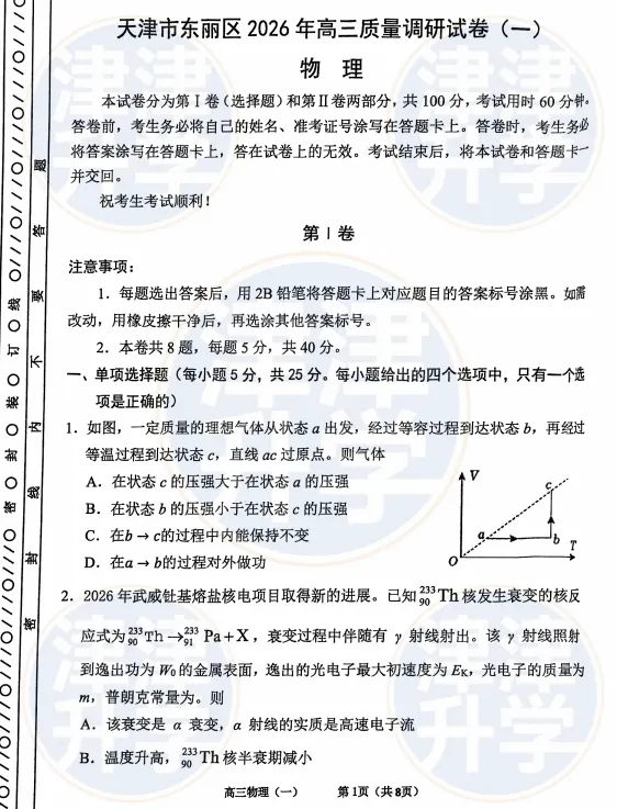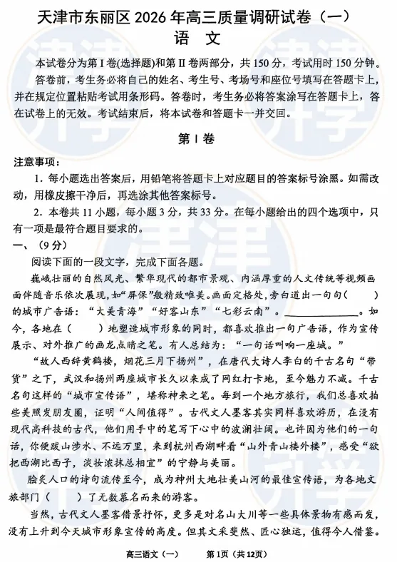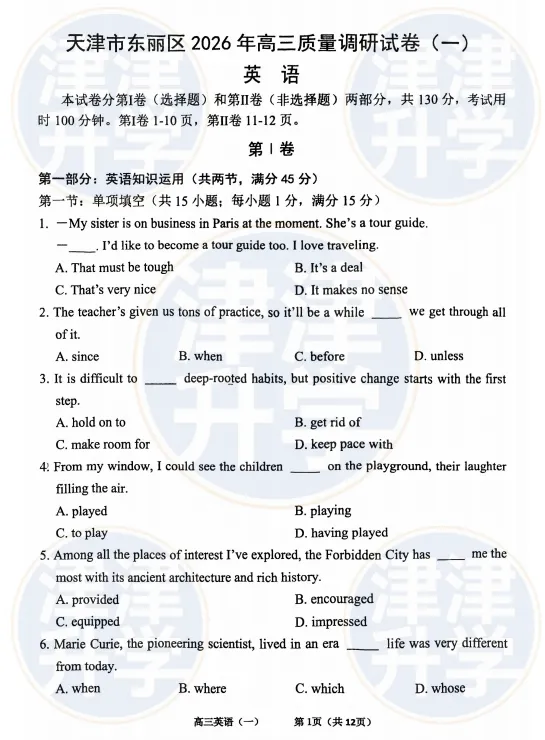 各科全丨2026天津高三(十二校)一模试卷&解析