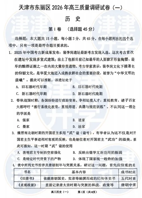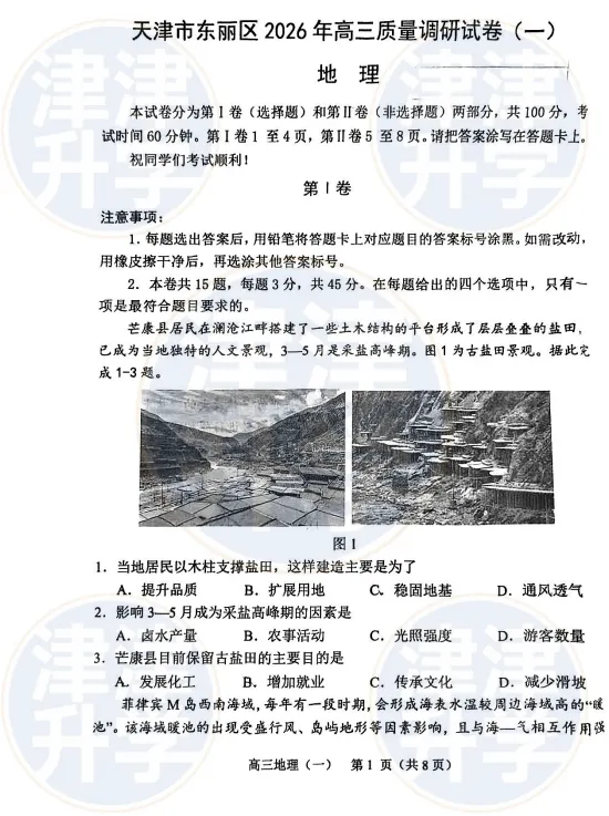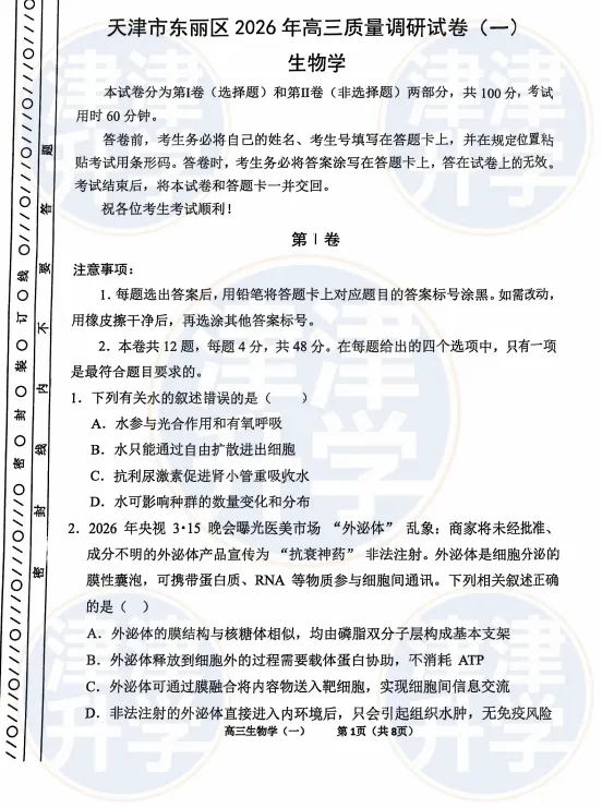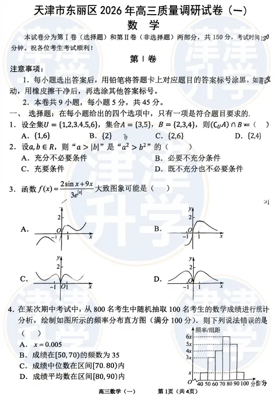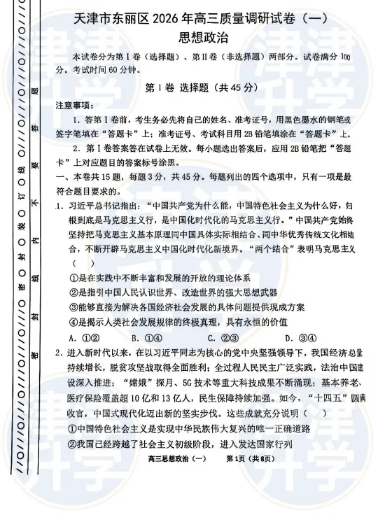 各科全丨2026天津高三(河北区)一模试卷&解析