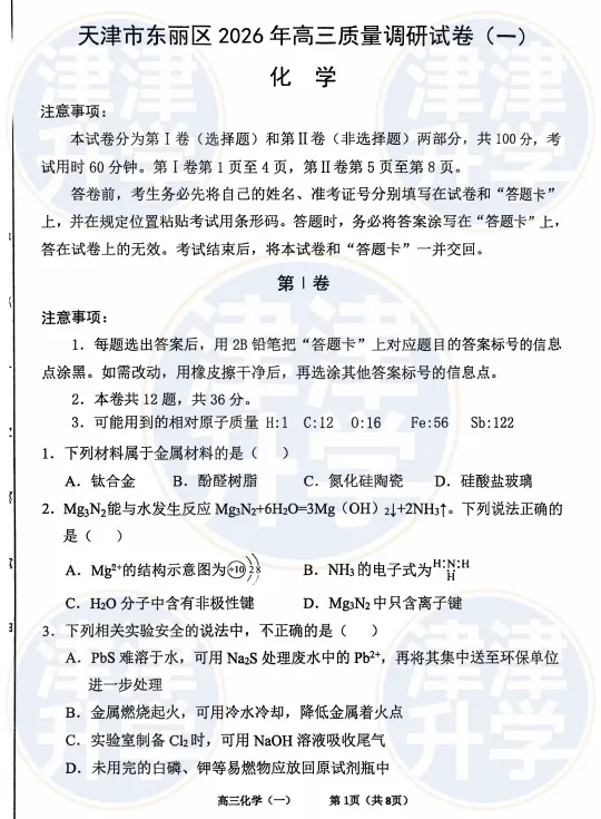 独家解析丨2026天津高三【化学】一模试卷(河东区)