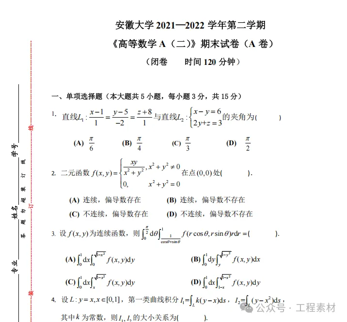 安徽大学《高等数学A二》2021-2022学年第二学期期末试卷及答案