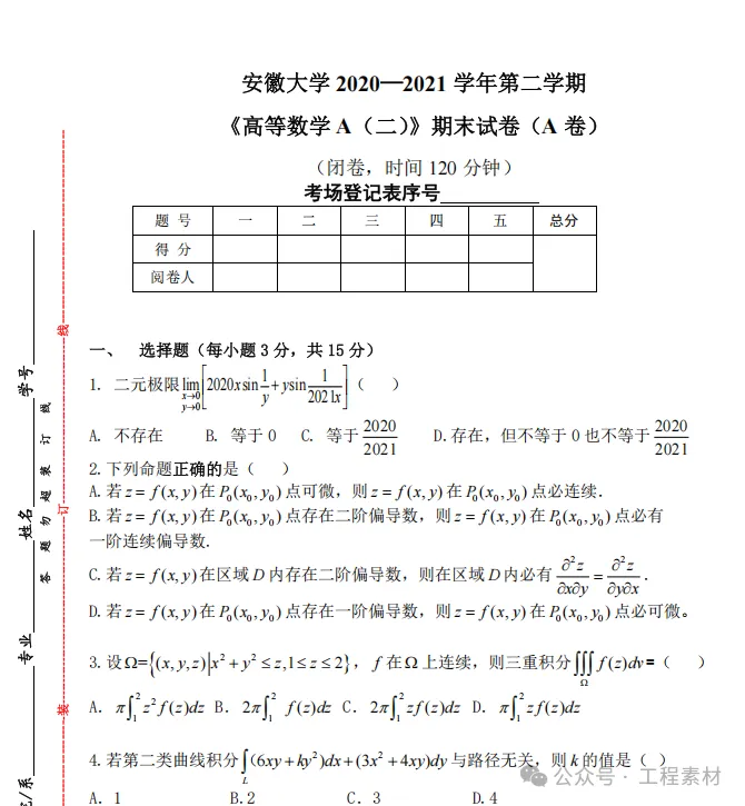 安徽大学《高等数学A二》2020-2021学年第二学期期末试卷及答案