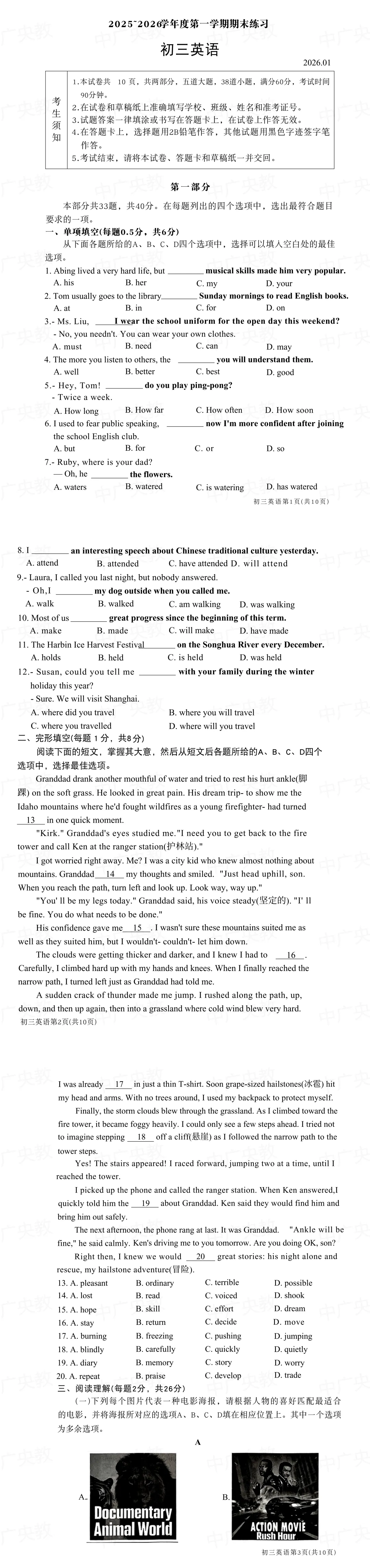 >2026 大兴区初三英语上期末|试卷+参考答案