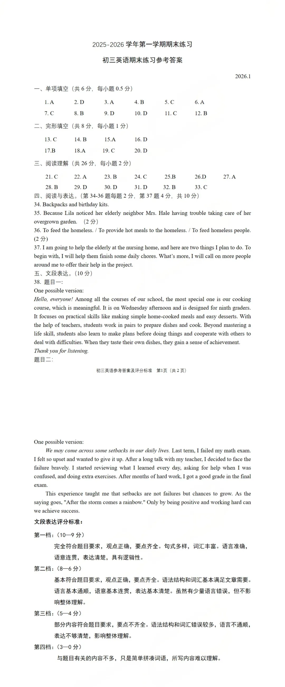 大兴区 2025-2026 学年度第一学期期末练习初三英语参考答案及评分标准已整理!家长们快保存,陪孩子一起复盘!