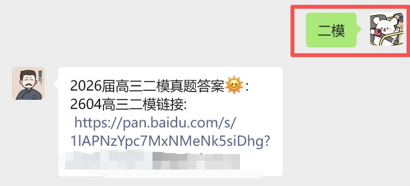 第二步:聊天框回复【二模】,即可领取26年(陆续更新)高三二模卷!