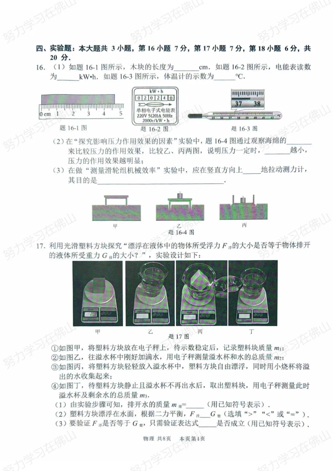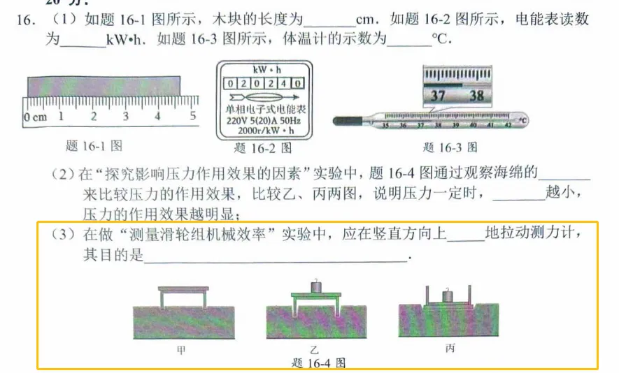 实验题整体有一定难度,共三道题:①第一题:与中考往年模式一致,包含仪器读数加“小实验”。小实验部分考了常规的“力的作用效果的影响因素”,同时也考了一道比较冷门的“机械效率”实验。机械效率实验通常在初二阶段学习考查,往年模拟考和中考中很少出现,今年中考需要特别重视。