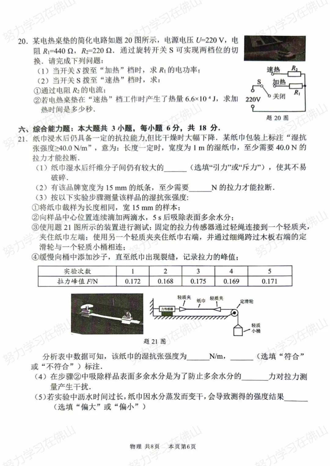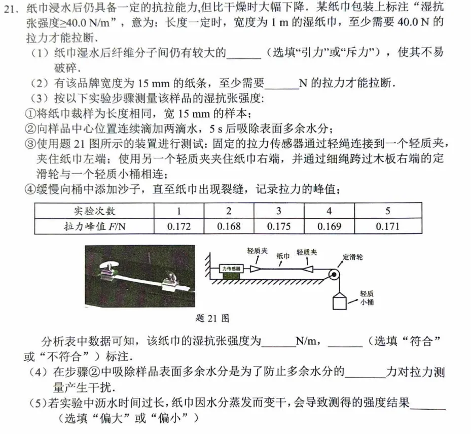 ①第一题:以“纸巾湿抗张强度”为背景,包含长文字、图表和新定义。尽管逻辑推理难度不大,但需要从新定义出发,考查分子引力、单位换算、数据处理、误差分析等知识点,会给学生带来较大的心理压力。
