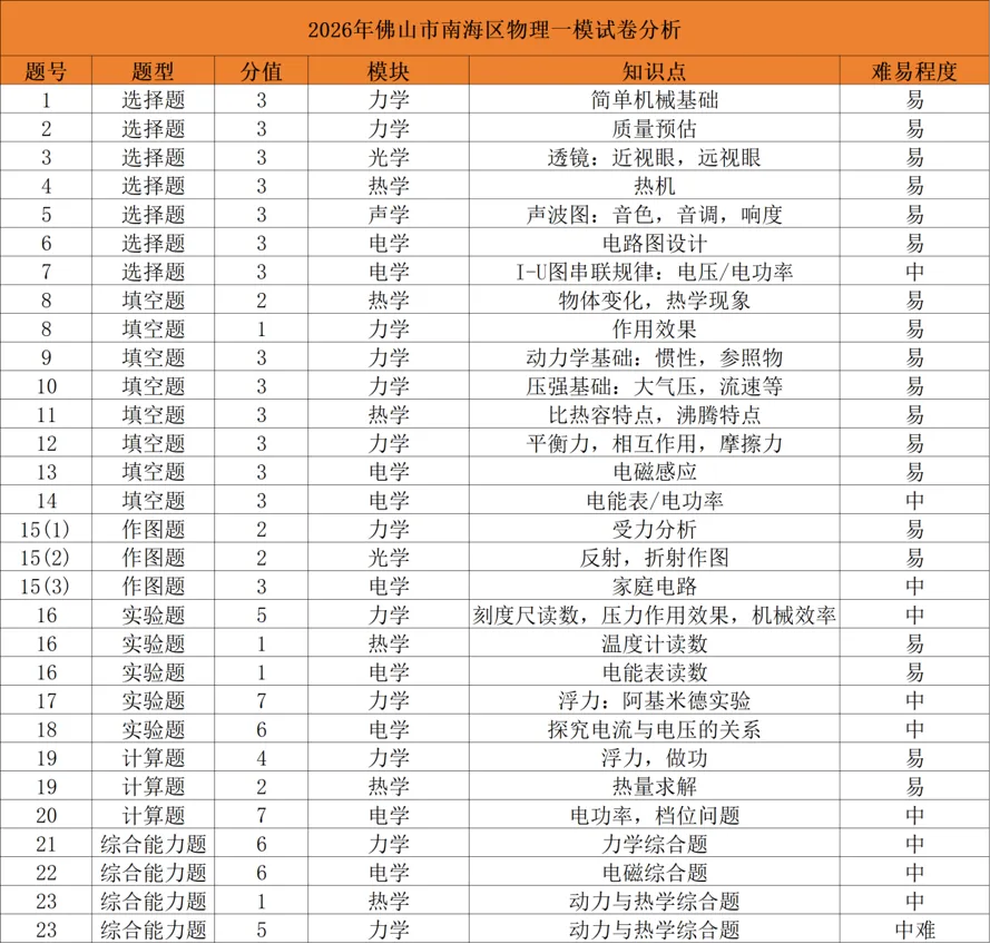 本次南海一模物理试卷,力学占48%(约48分),电学占35%(约35分),两者合计超过80%,是绝对的复习重点。热学(9%)、光学(5%)、声学(3%)占比虽小,但题目简单,属于必拿分。