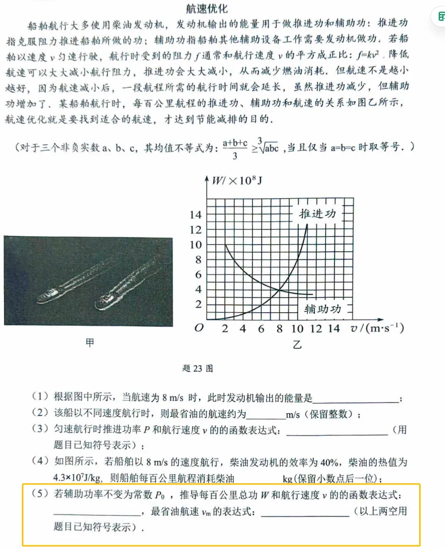 ③第三题:功率与动力学综合题,结合船舶“航速优化”进行考查,涉及热,功率推导、效率计算、数学函数推导。尤其最后两空难度非常大,能够完整做出来的学生属于顶级水平。