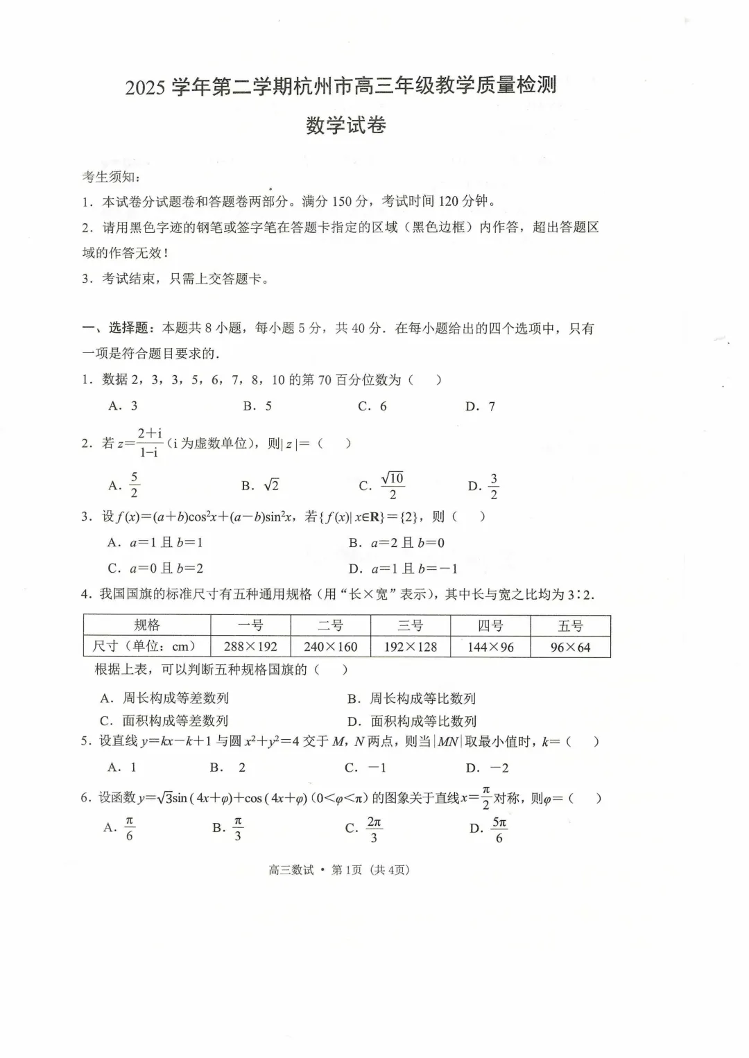 杭州二模数学试卷4月7日考