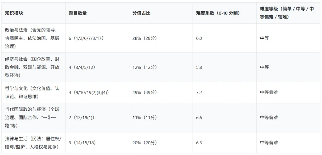难题:约 25%(16;主观题19为核心难点,17、18为中上难度)