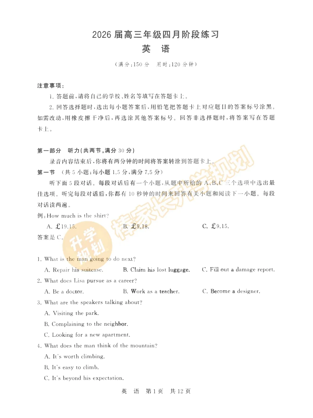 回复【黄石】,领取2026黄石高三3月联考试卷答案