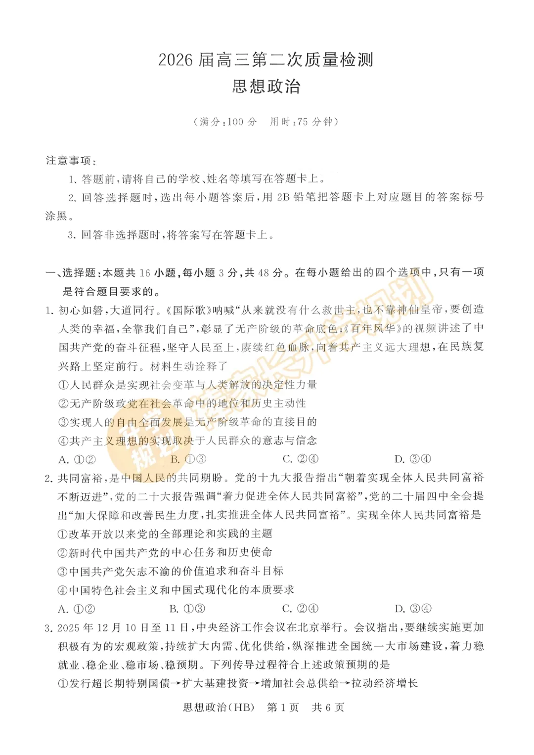 回复【二调】,领取2026武汉高三二调各科试卷资料