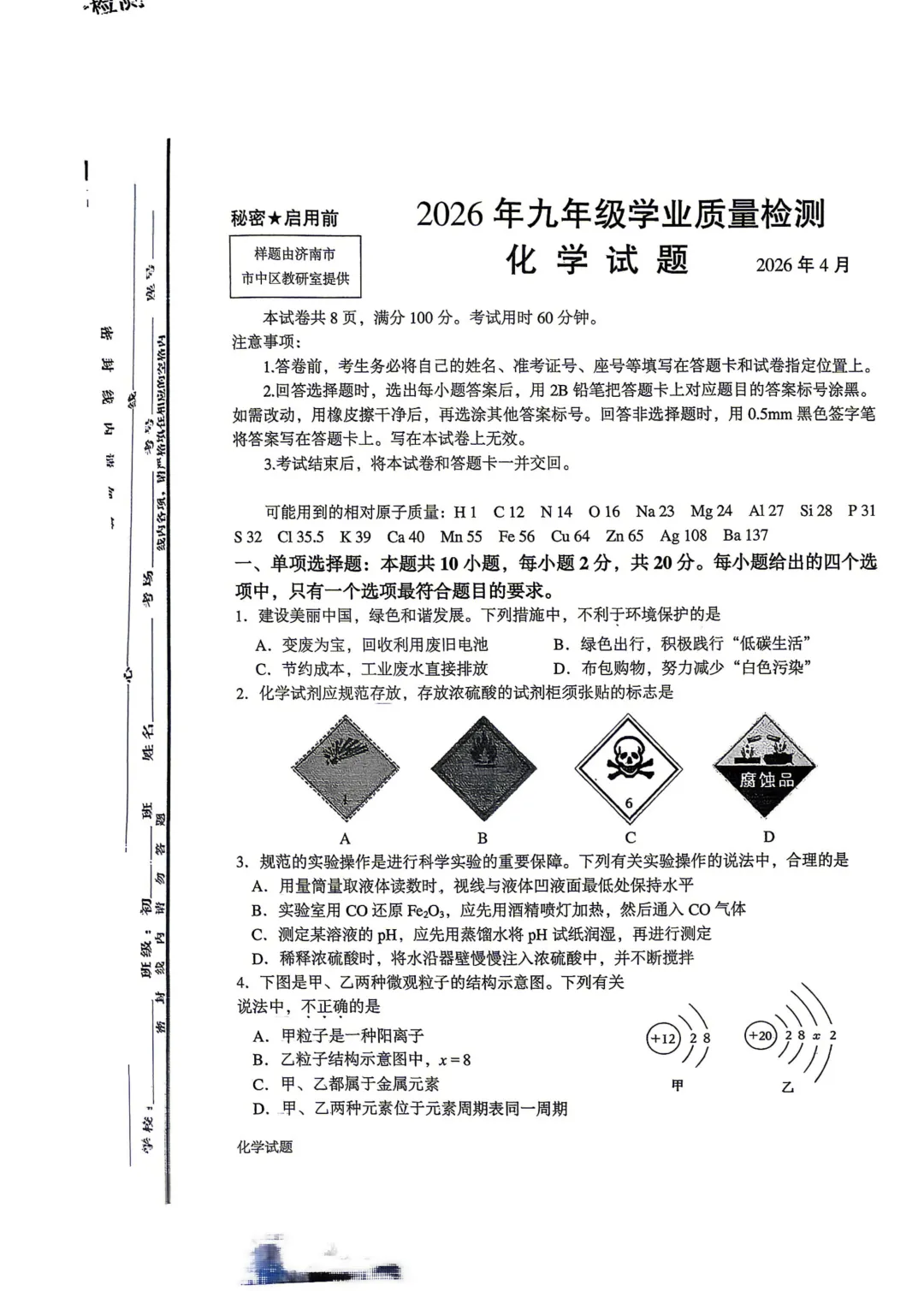 2026年山东济南市市中区九年级学业质量监测化学试题.pdf
