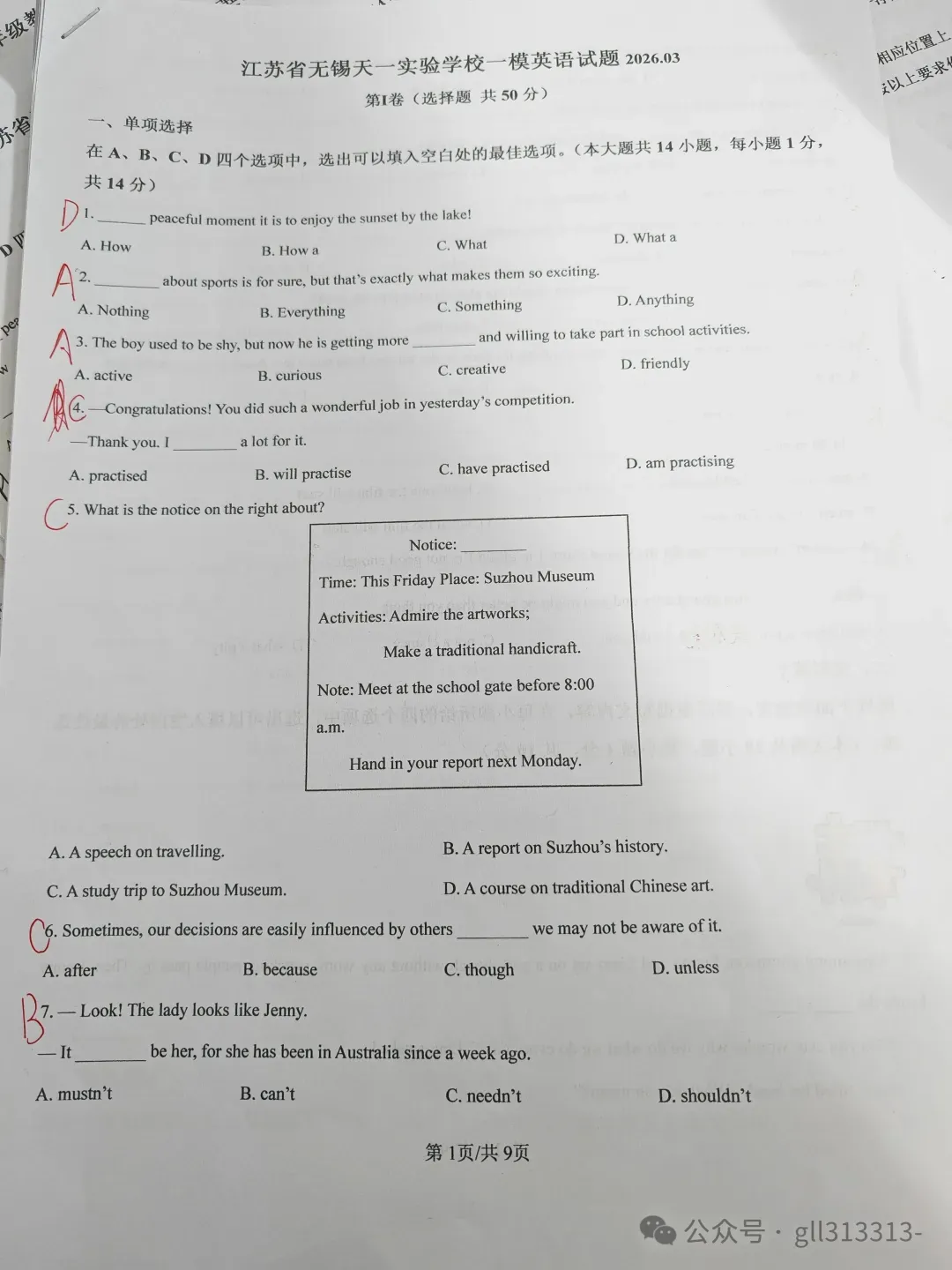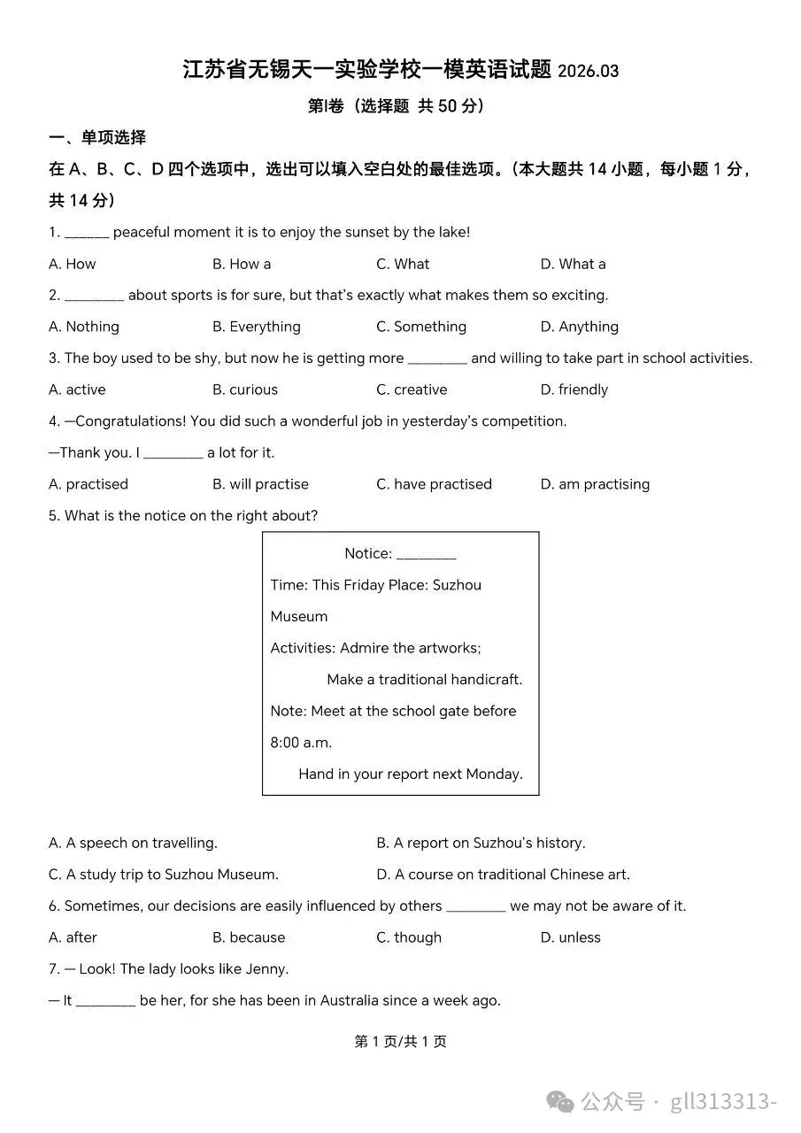 >2026无锡天一实验学校中考一模英语试卷+答案(2026.3)