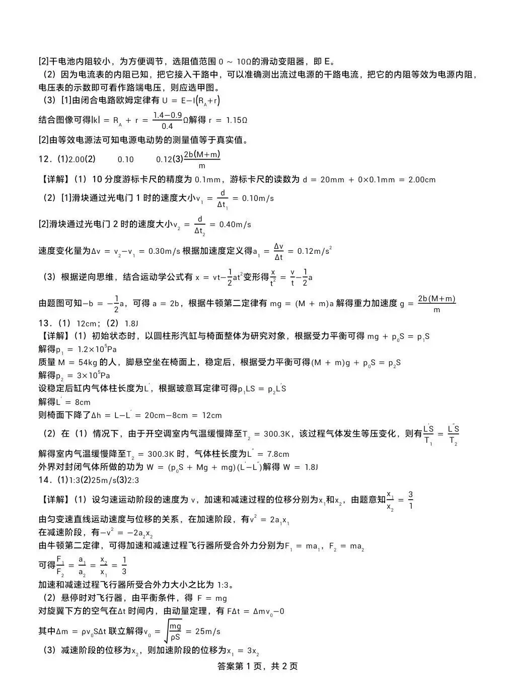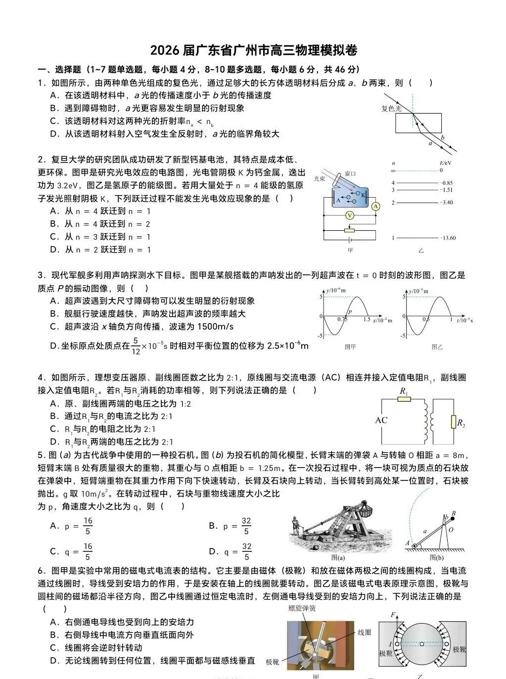 2023届广州市普通高中毕业班综合测试(二)广州二模物理试卷及答案