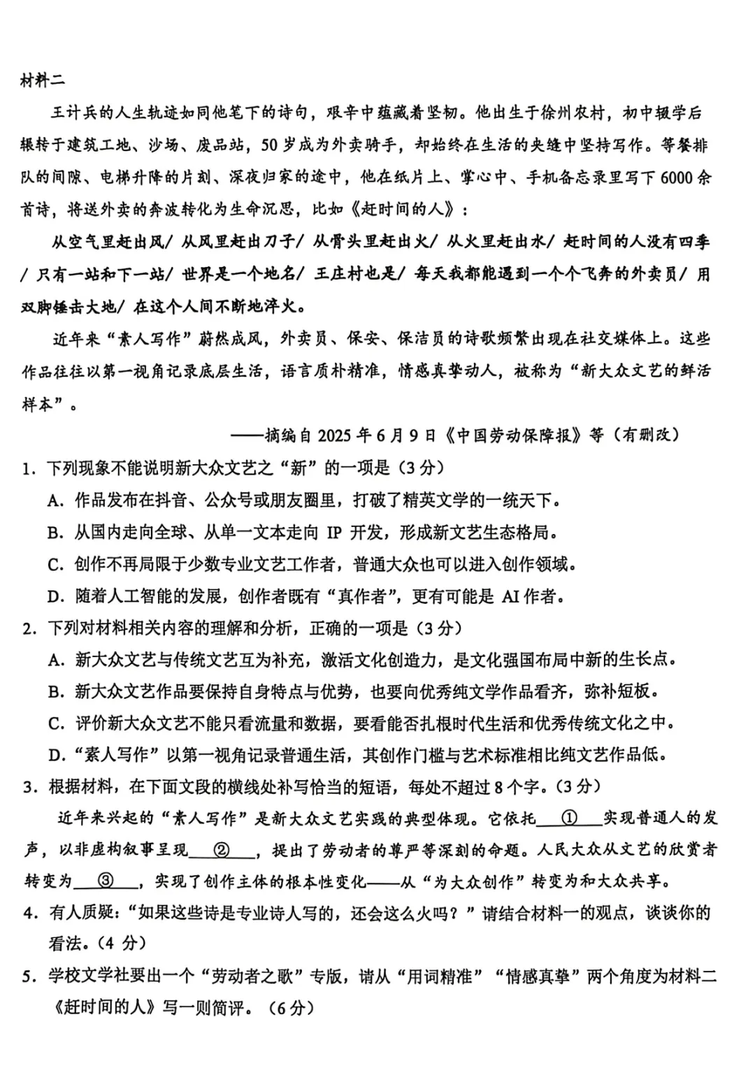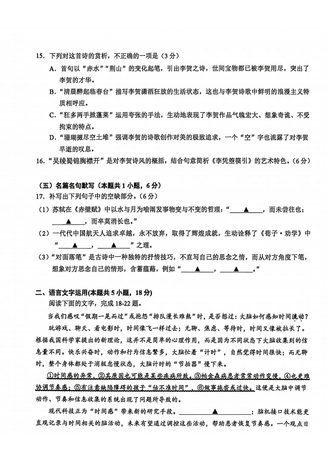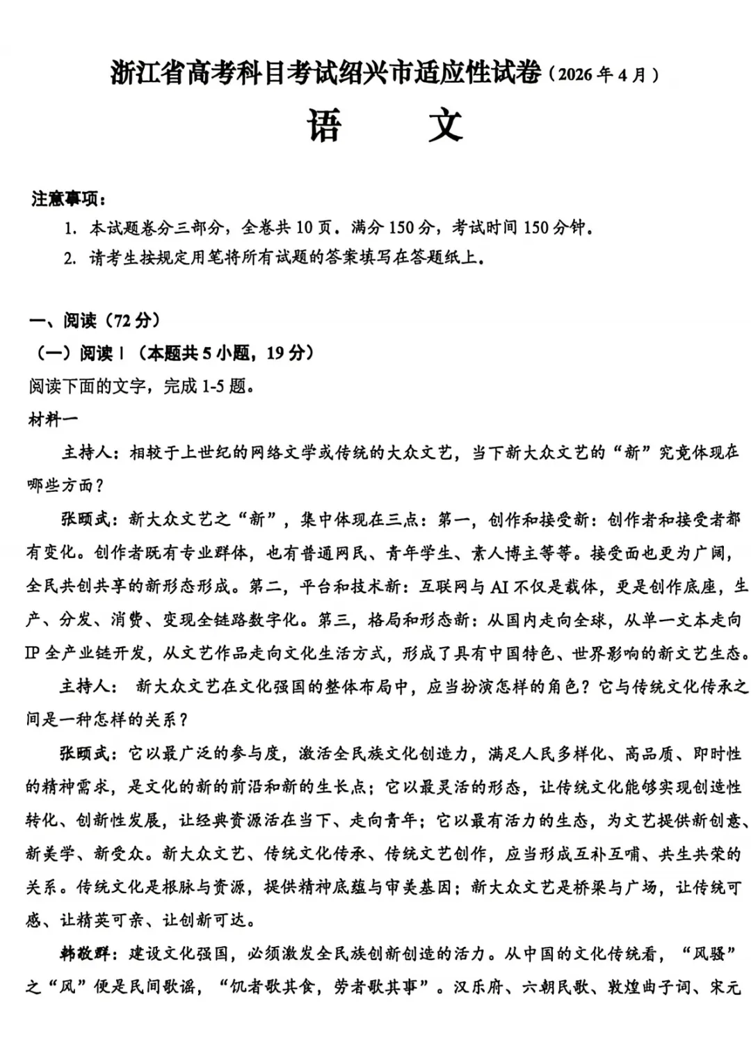 2026年4月高三绍兴诊断二模语文试卷及答案