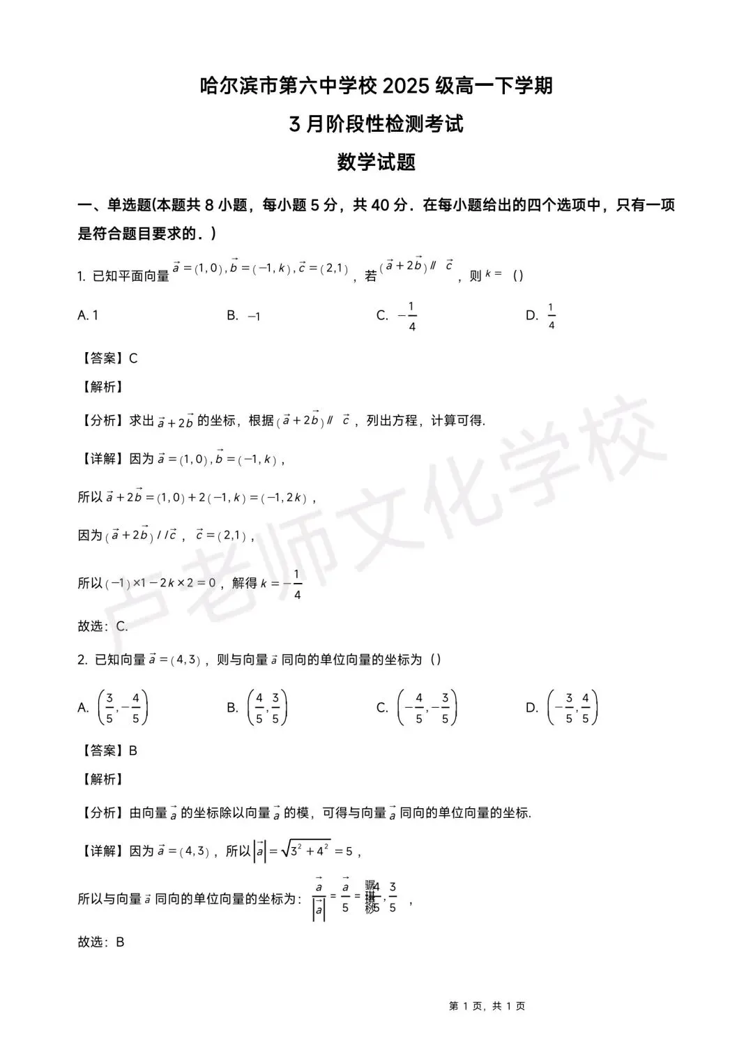 26年3月哈六中高一数学3月份月考测试试卷+答案(免费下载)