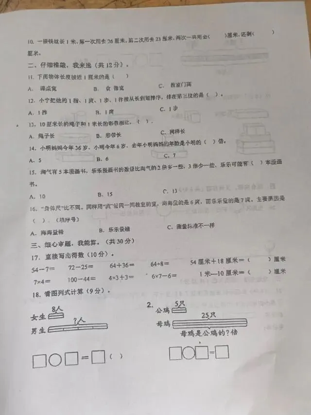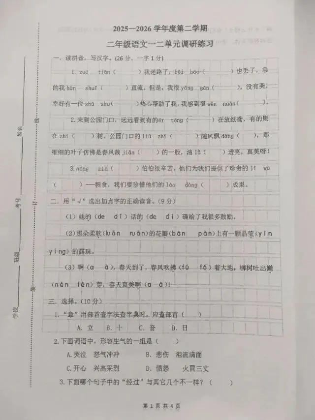 二年级语文数学下册一二单元月考试卷