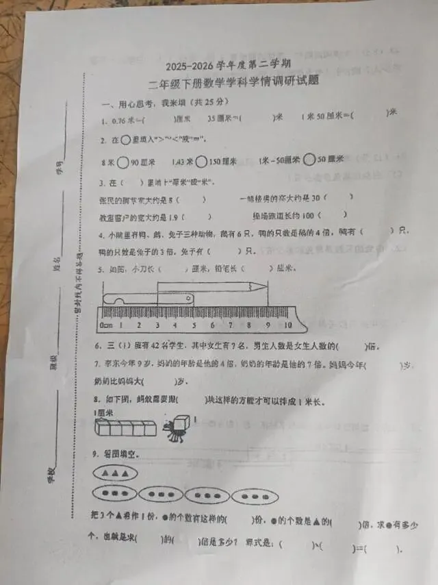 >二年级语文数学下册一二单元月考试卷