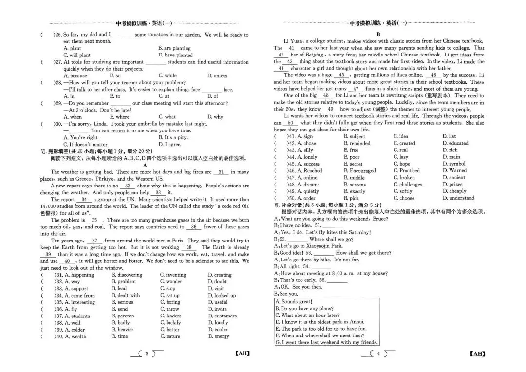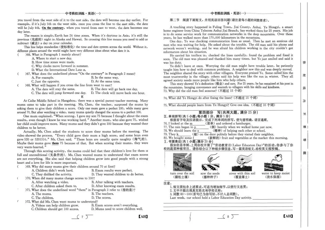 参考答案 第一部分 听力 1~5 CBCAB 6~10 ACACB 11~15 ACBCA 16. Sunday 17. chickens 18. friendly 19. planned 20. understand 第二部分 语言知识运用 21~25 CABAD 26~30 DABAC 31~35 ADCAB 36~40 BCACD 41~45 CBCDA 46~50 BACBD 51~55 BADFC 第三部分 阅读 56~58 ABD 59~61 BAD 62~65 CADB 66~68 DCB 69~72 DACB 73—75略 第四部分 写 76. menu77. pour78. spirit79. knocked 80, fresh 作文略 |